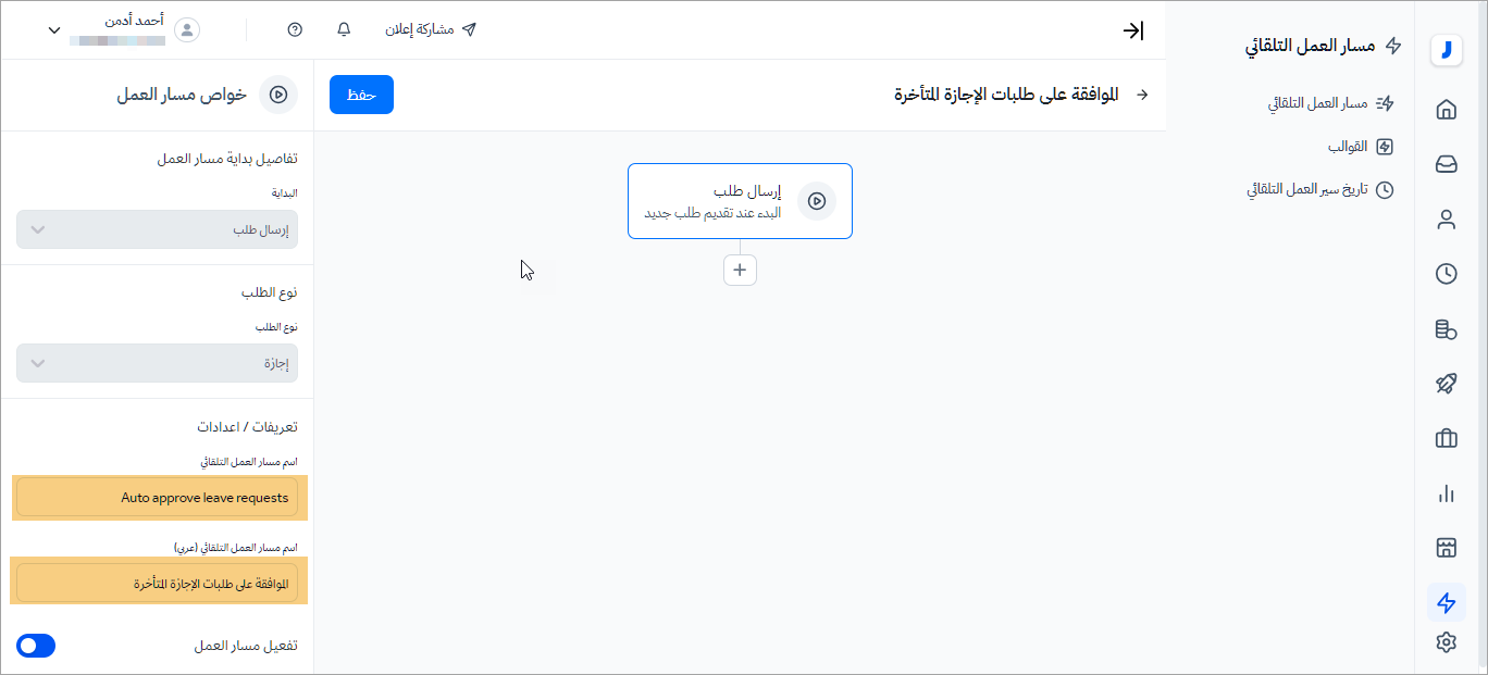 2- قم بإضافة إسم لمسار العمل التلقائي باللغتين ، ضمن قسم ( خواص مسار العمل ).