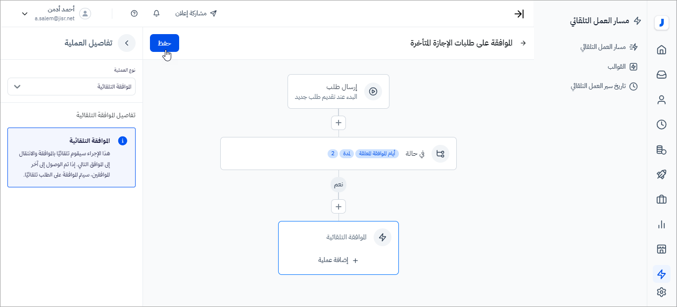 8- قم بإختيار نوع العملية أو الإجراء ( الموافقة التلقائية ). ثم قم بحفظ هذا المسار، لتفعيله على النظام.
