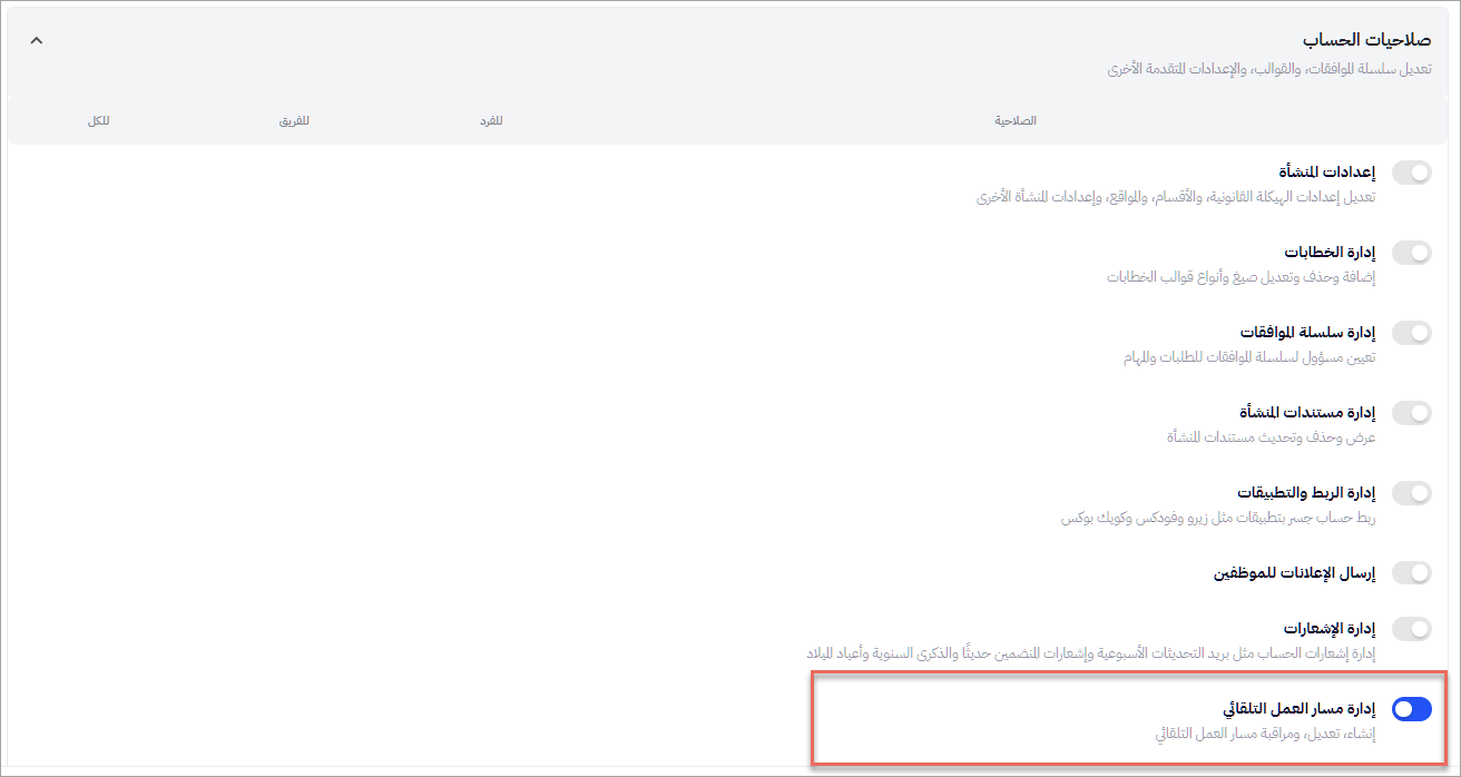 - يمكن لمشرف النظام من منح الصلاحية لأي مستخدم عن طريق تفعيل الخيار الخاص بـ ( إدارة مسار العمل التلقائي ) ضمن ( صلاحيات الحساب ).