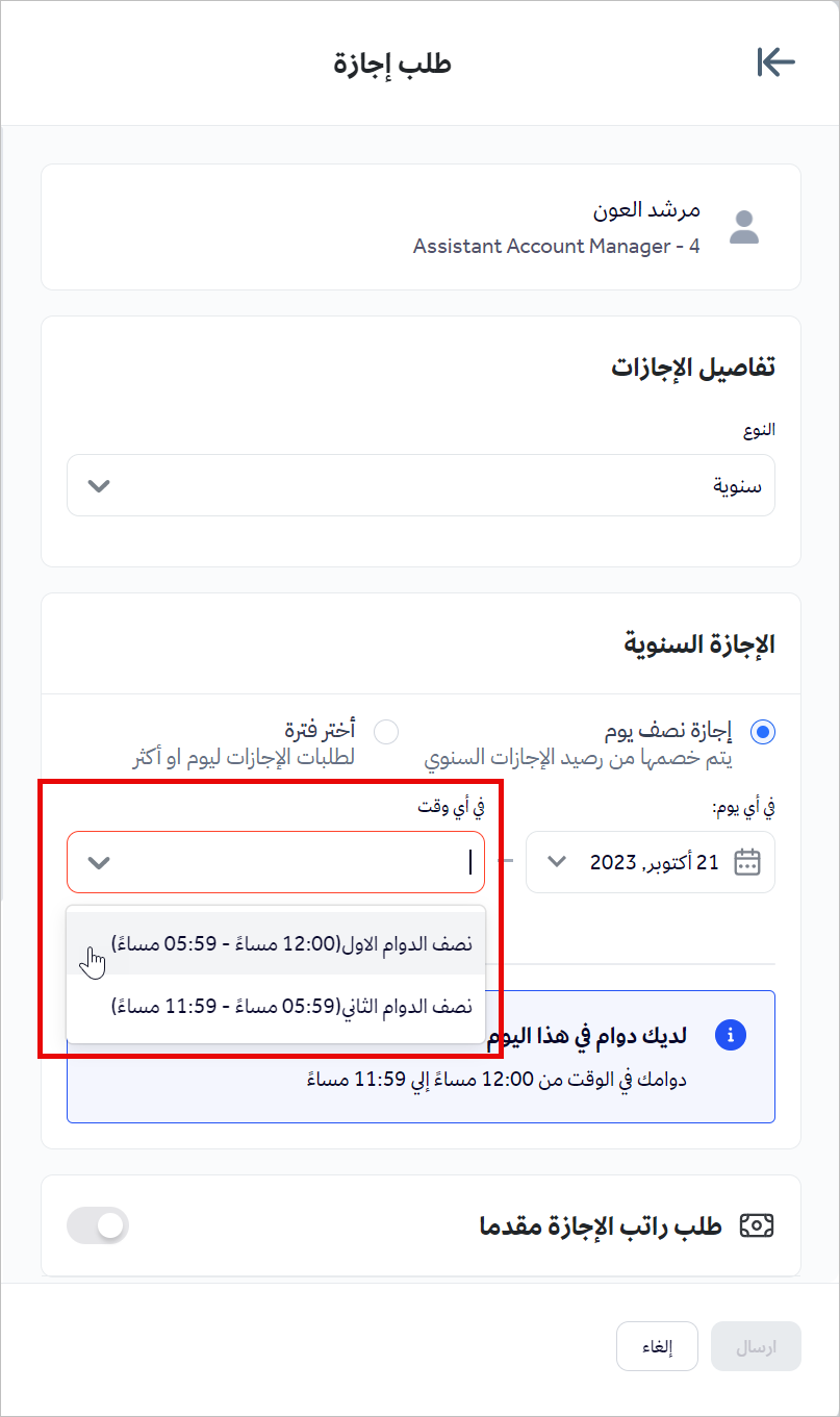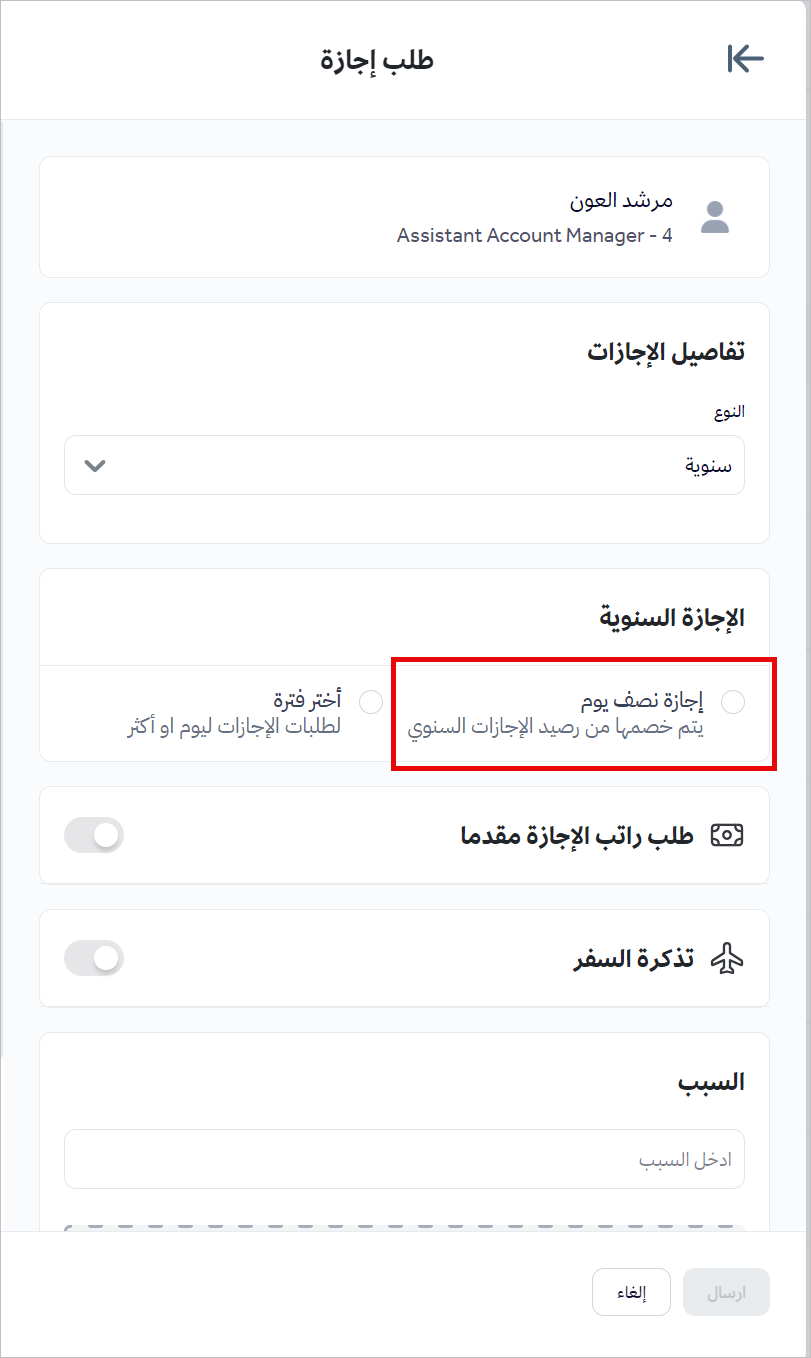 أخيراً : عند قيام الموظف بتقديم طلب إجازة سنوية ضمن تطبيق الخدمة الذاتية ( الويب أو الجوال ) ، سيكون خيار إجازة نصف اليوم ظاهر ضمن الطلب.