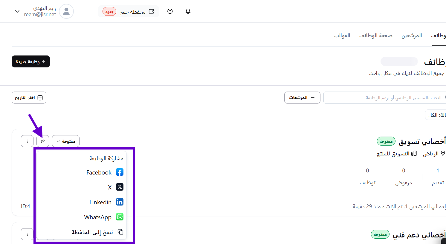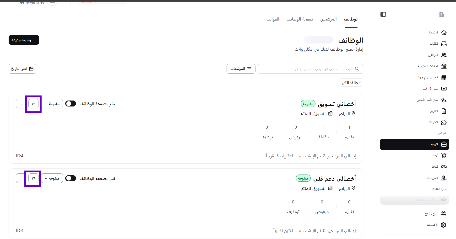 يمكن لمشرف النظام أو مدراء التوظيف من مشاركة ونشر الإعلانات للوظائف المتاحة ( حالتها مفتوحة ) على وسائل التواصل الإجتماعي ، أو نسخ رابط إعلان الوظيفة عن طريق البريد الإلكتروني أو غيره ، من خلال خيار النشر المتاح لكل الوظائف المتاحة في صفحة الوظائف.