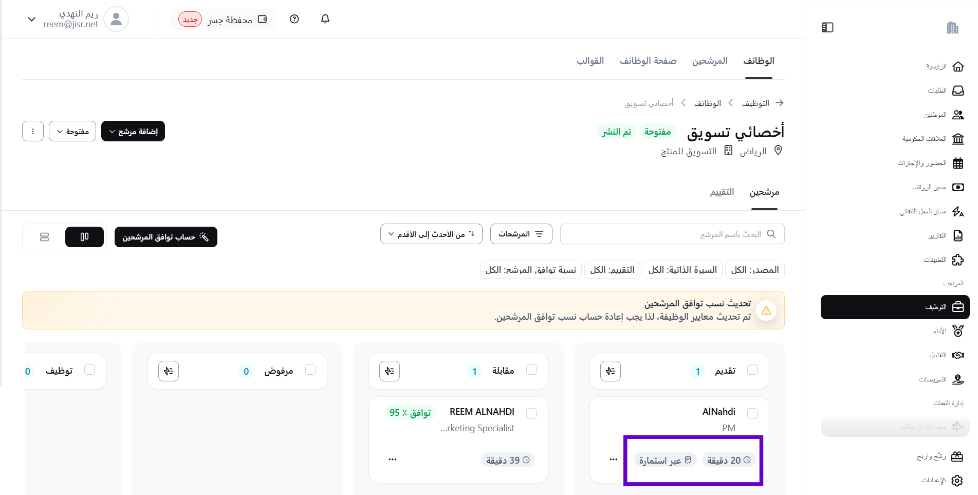 سيتم تمييز الموظفين المتقدمين للوظائف ضمن صفحة تفاصيل الوظيفة أو صفحة المرشحين بالعبارة ( عبر استمارة ) وكذلك وقت التقديم للتمييز بين المتقدمين عن طريق رابط الإعلان الوظيفي ، من المرشحين الذين تتم إضافة بيناتهم بشكل يدوي أو عن طريق القالب.