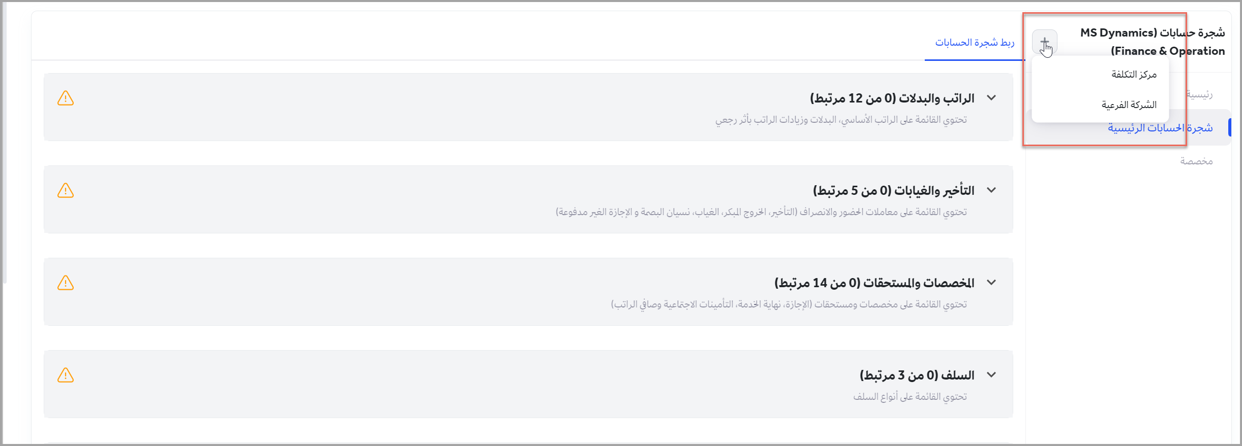 في حال وجود شجرة حسابات خاصة ، يمكن للمسؤول إجراء عملية الربط على مستوى الشركة الفرعية أو مركز التكلفة أيضاً.