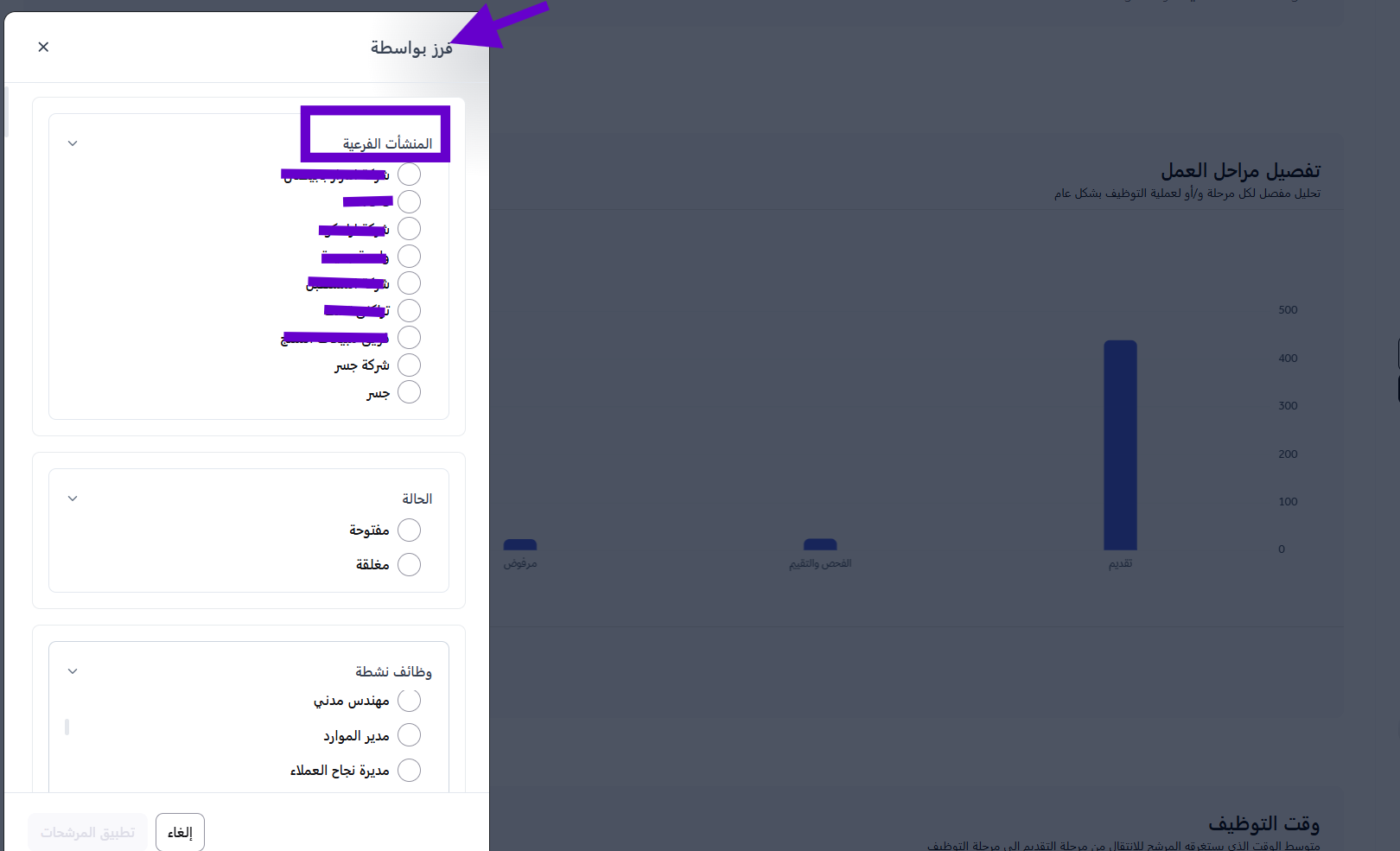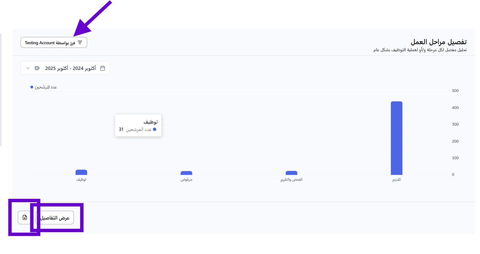يعرض هذا المخطط الشريطي عدد المرشحين في كل مرحلة من مراحل عملية التوظيف. حيث يعرض الرسم البياني إجمالي المتقدمين في جميع المراحل على النظام ( مرحلة التقديم، الفحص والتقييم، مرحلة المرفوضين، مرحلة التوظيف).إذا كانت الشركة الفرعية مرتبطة بالشركة الرئيسية وتمتلك نظام التوظيف (ATS)، فيمكن للمسؤول عرض مراحل الوظائف الخاصة بتلك الشركة الفرعية من خلال التصفية باسم الشركة.