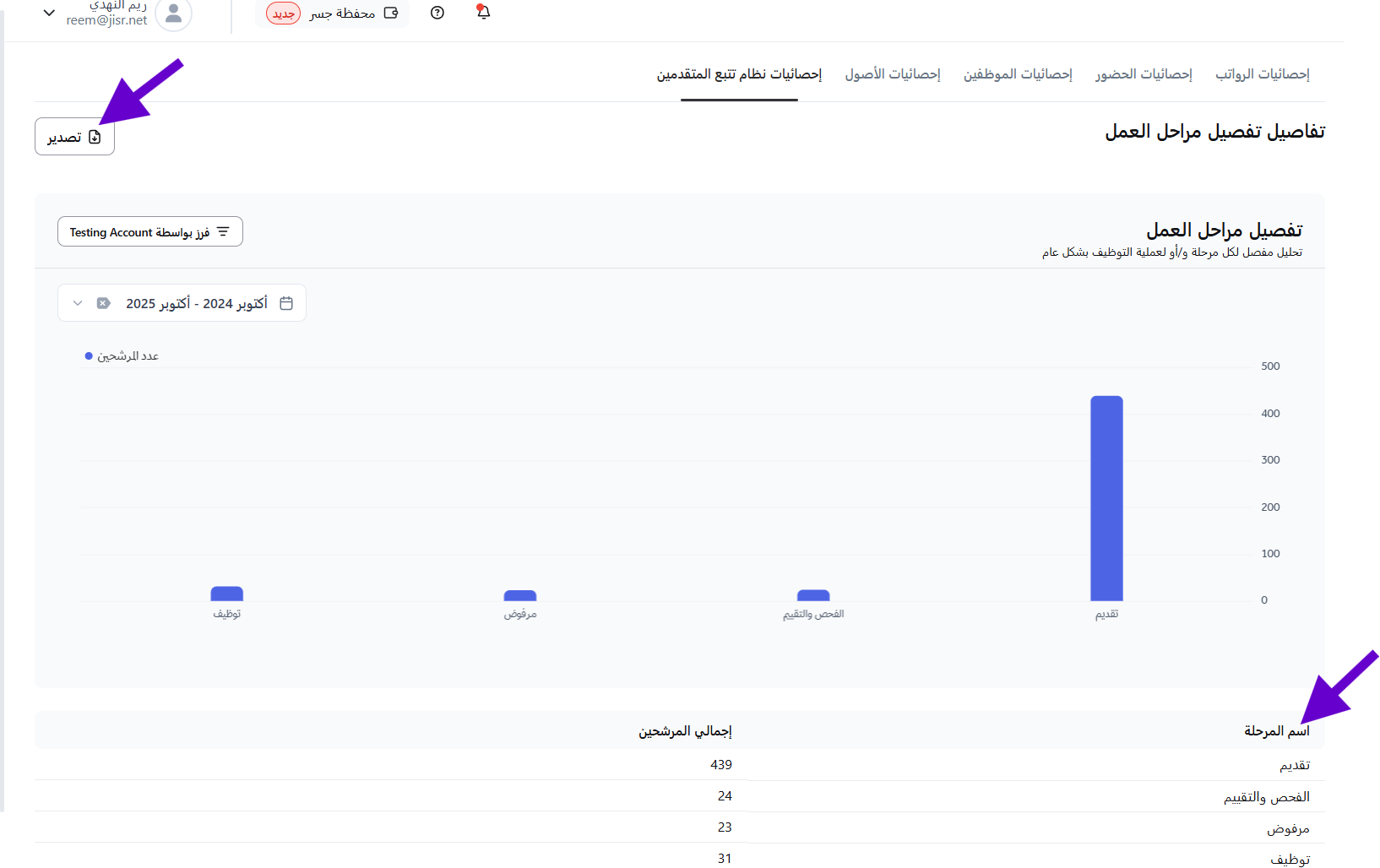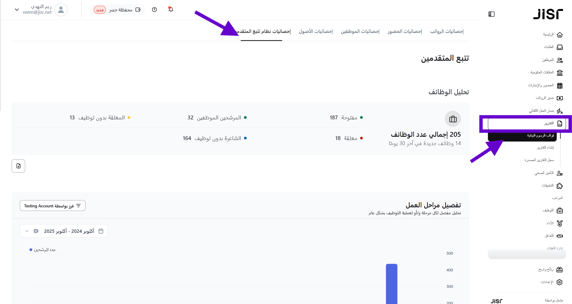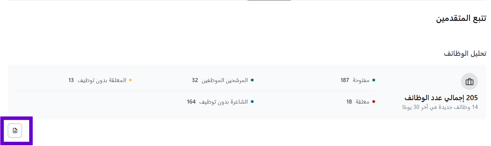يمكن الوصول إلى الإحصائيات الخاصة بنظام تتبع المتقدمين بإتباع الخطوات التالية: