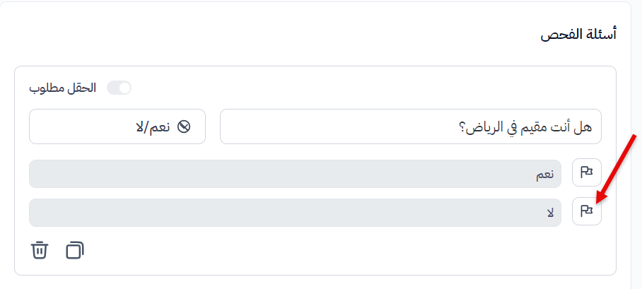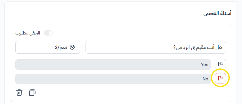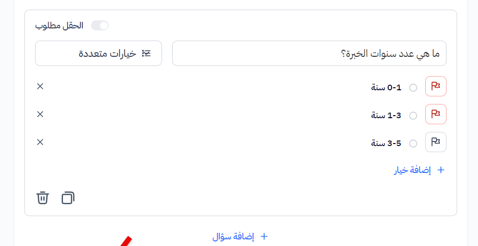 بعد صياغة السؤال المطلوب واختيار نوع السؤال المناسب، يمكنك تنشيط ميزة 'الرفض التلقائي' للإجابة عن طريق الضغط على العلم بجوار الإجابة التي ترغب في رفضها تلقائيًا من المتقدمين.