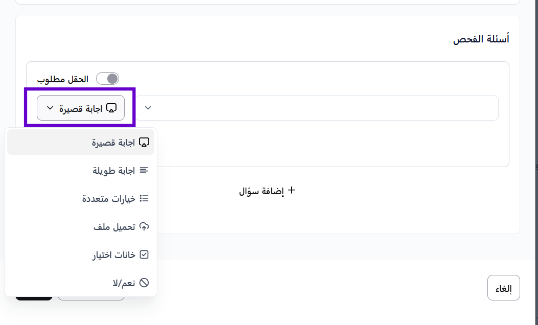 عند إضافة الأسئلة، سيُطلب منك اختيار نوع السؤال. تذكر أن ميزة ' الرفض التلقائي' للإجابات متاحة حصريًا لأنواع الأسئلة 'نعم/لا'،'خانات اختيار' و'خيارات متعددة'.