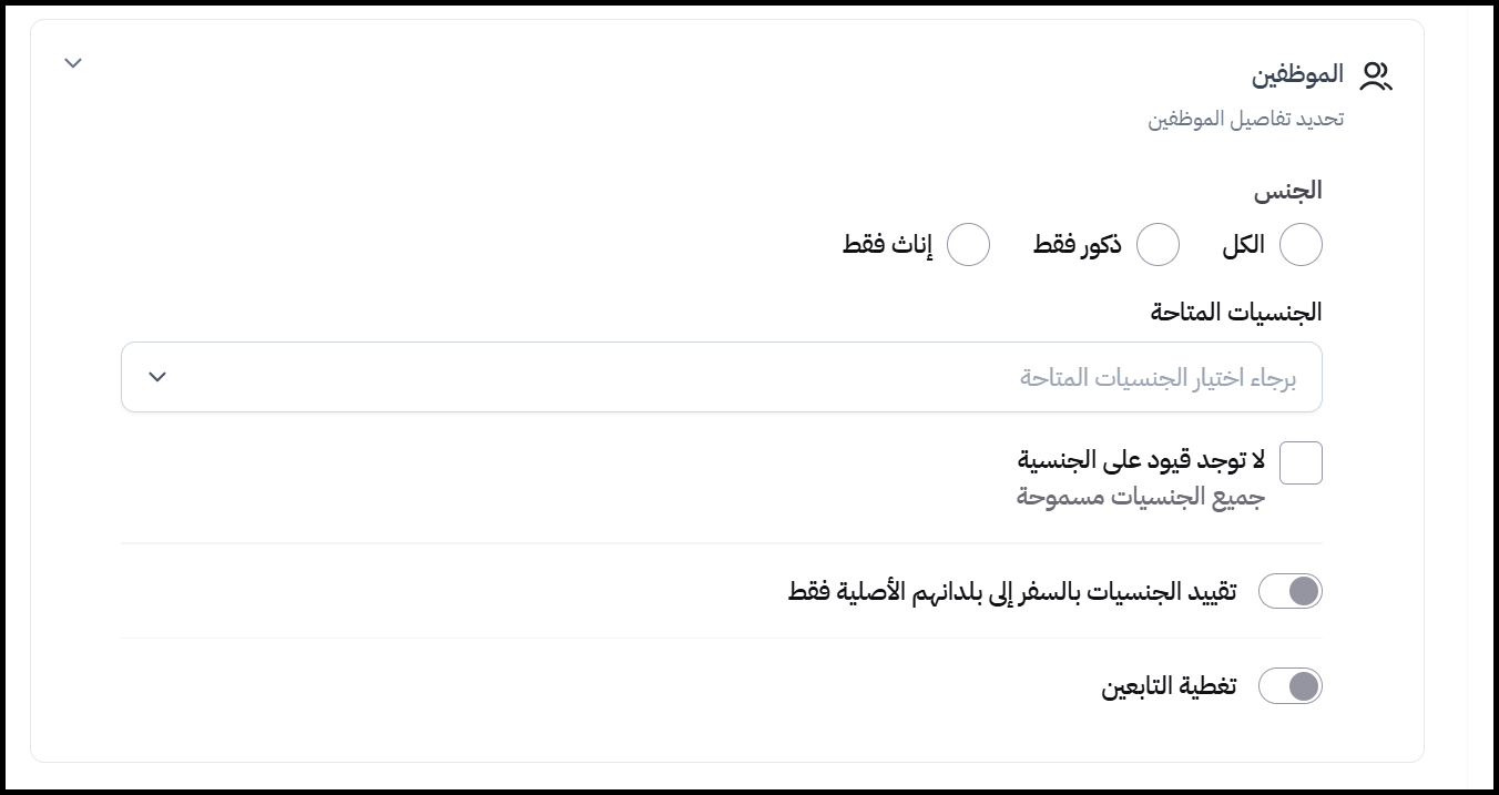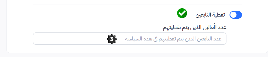 في قسم "الموظفين"، يمكنك التحكم في تغطية الأفراد التابعين للموظف، وتحديد عدد المعالين لهذا الموظف الذين يمكن تغطيتهم بتذاكر الطيران. ويمكن تعطيل هذا الخيار لمنع تغطية التابعين نهائيا.