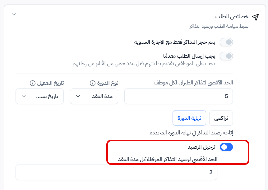 - عند تفعيل زر 'ترحيل الرصيد'، ستسمح للموظفين بترحيل تذاكر الطيران غير المستخدمة خلال الدورة إلى الدورة القادمة، ويمكنك أيضًا تحديد الحد الأقصى لعدد التذاكر التي يمكن ترحيلها لكل سنة.