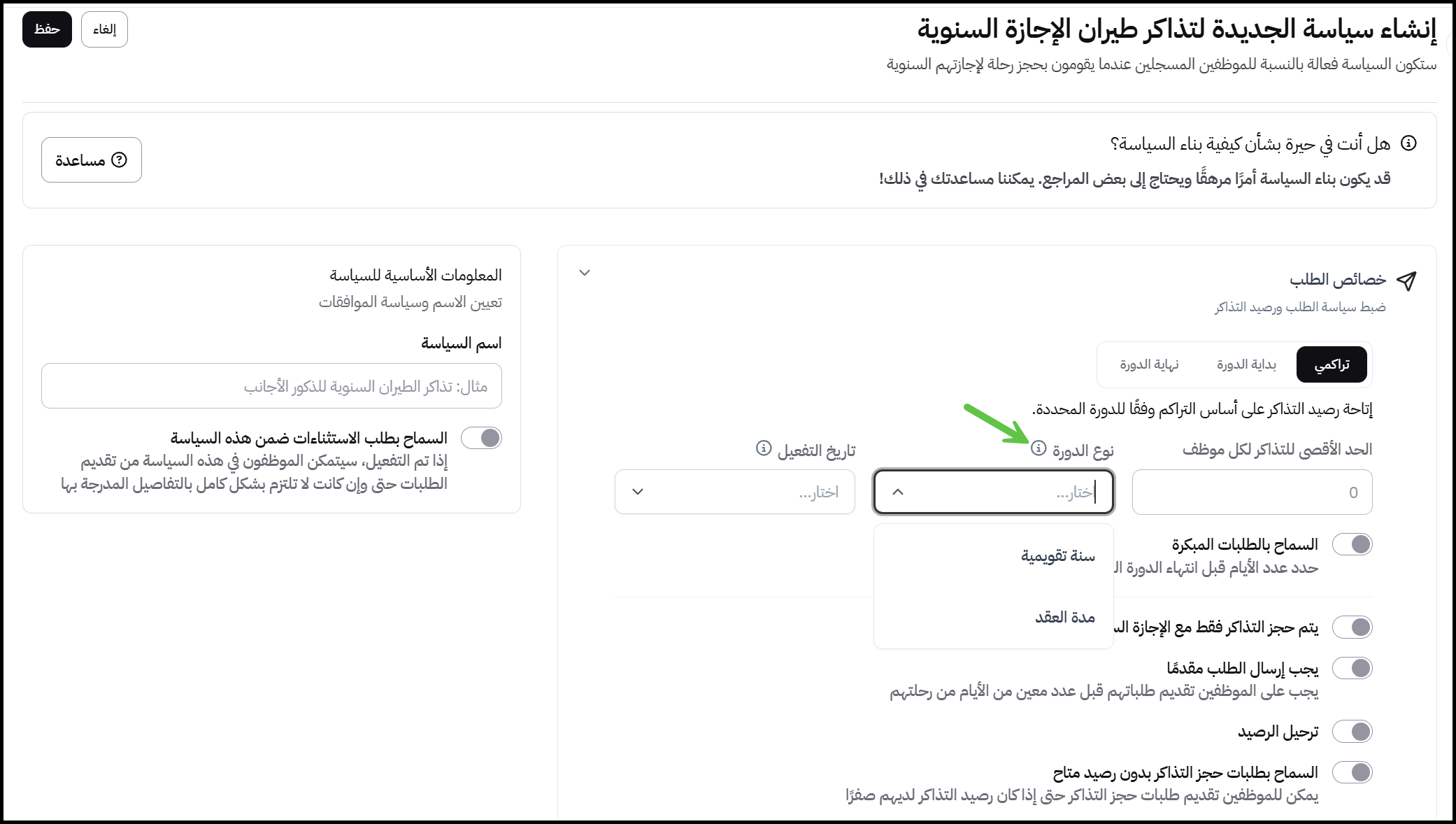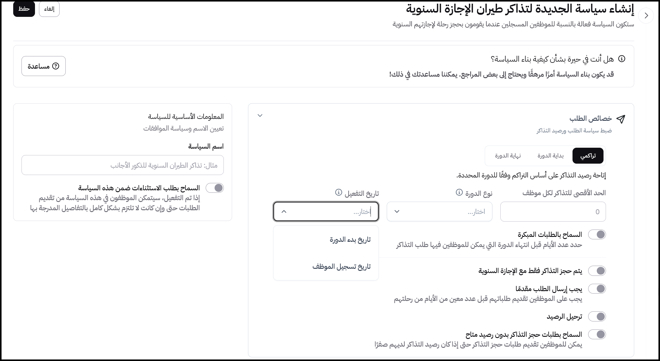 - نهاية الدورة: يُمنح رصيد التذاكر كامل للموظفين في نهاية الدورة الخاصة بالسياسة، بحيث يكون الرصيد السنوي الكامل متاحًا في آخر الدورة.