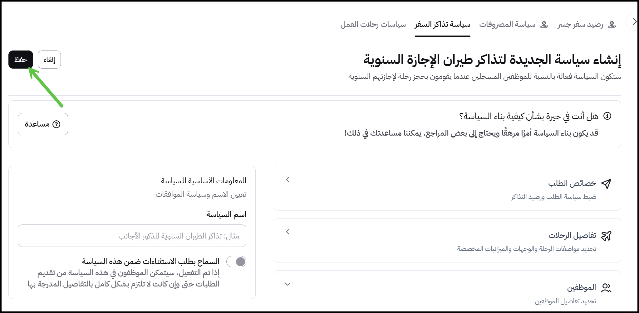 لتفعيل السياسة وبدء العمل بها، يجب أولًا التأكد من إضافة كل الخانات المطلوبة وإضافة الموظفين للسياسة لتفعيلها لاحقًا. مزيد من التفاصيل في مقالة إضافة الموظفين لتذاكر الطيران السنوية.