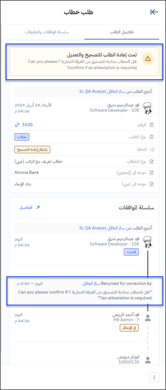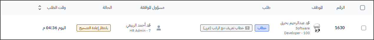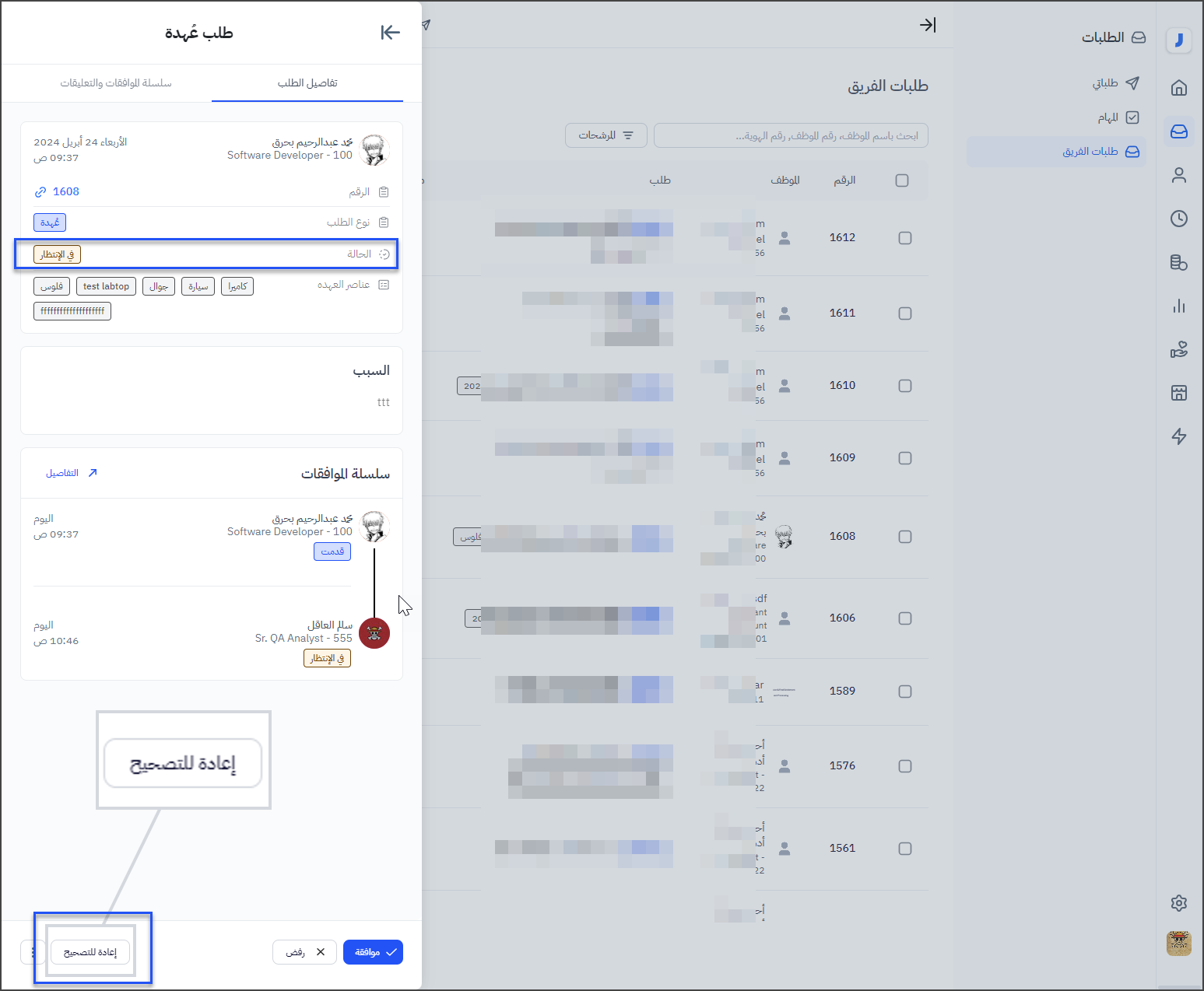 - يمكن للموظف الاطلاع على سبب الإعادة للتصحيح والتعديل الذي تمت كتابته من قبل المدير ضمن تفاصيل الطلب.
