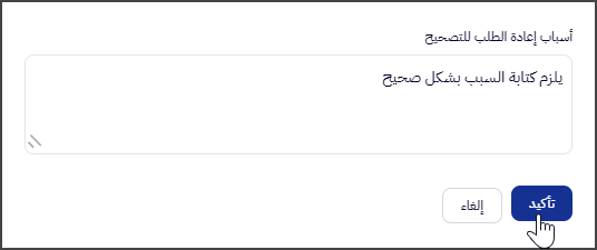 حيث يمكن لمشرف النظام أو الشخص في سلسلة الموافقة من إعادة الطلب المرفوع إلى الموظف مقدم الطلب من أجل عمل تصحيح للطلب، شريطة أن يكون حالة الطلب ( في الانتظار ) من خلال النقر على خيار ( إعادة التصحيح ) الظاهر في نفس صفحة تفاصيل الطلب. مع ضرورة ذكر السبب من قبل مشرف النظام أو الشخص في سلسلة الموافقات في خانة ( سبب إعادة التصحيح ).