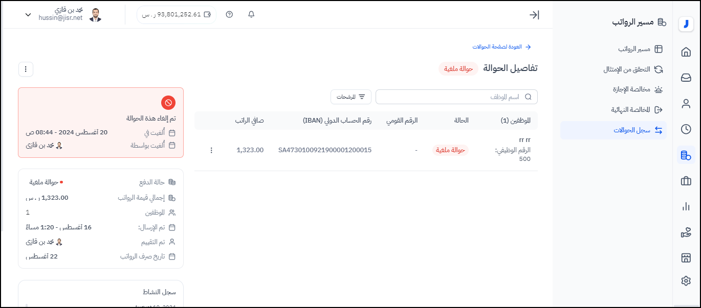 ملحوظة: يتم تحديث الحالة الخاصة بالحوالة بعد 30 دقيقة على الأقل من إرسال مسير الواتب للبنك.