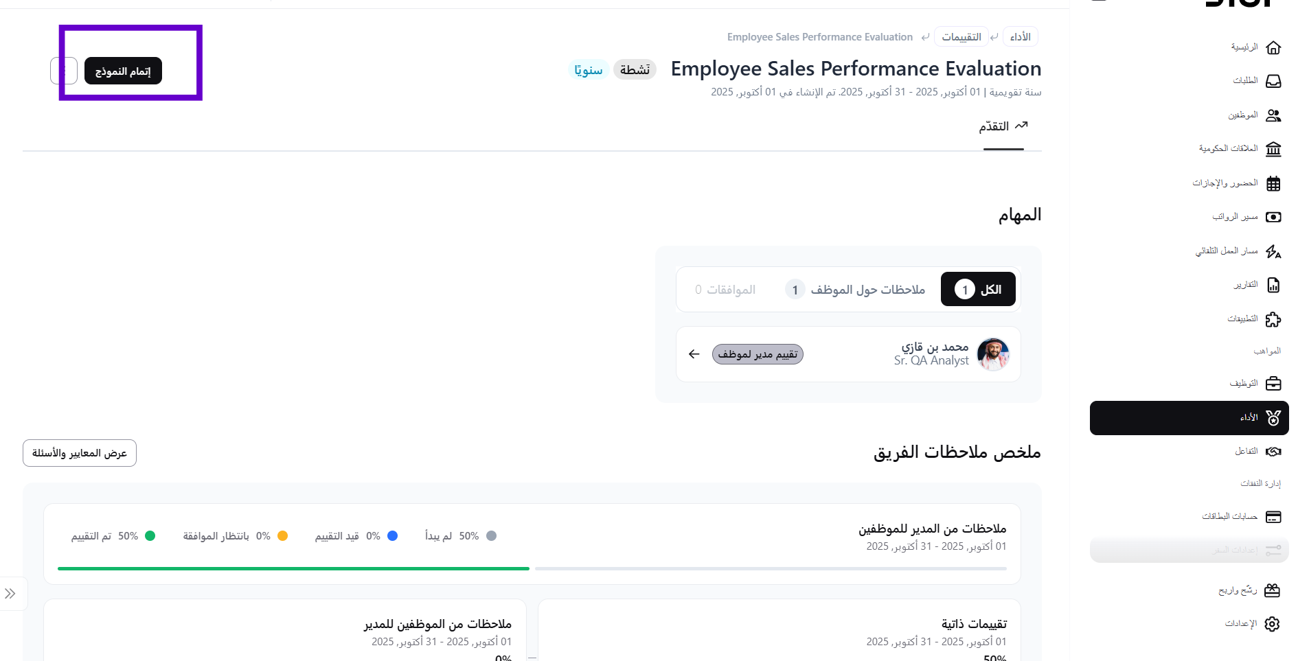 ١. بمجرد انتهاء عملية التقييم، يمكن للمشرفين إختيار "إتمام النموذج".
