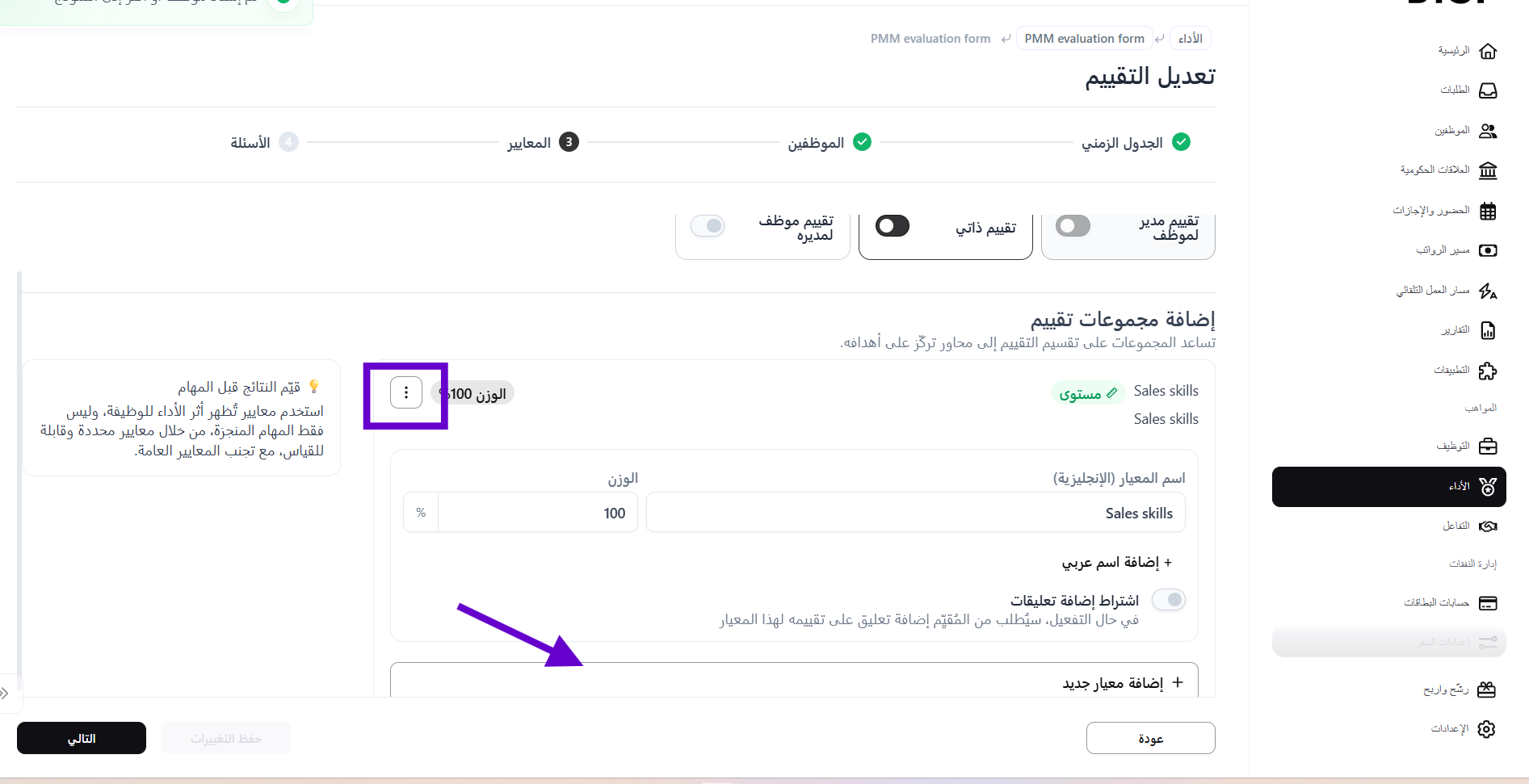 ٤. يمكن إضافة مجموعات جديدة، ويمكن حذف المجموعات والمعايير الحالية إذا لزم الأمر. ولكن، إذا كان نموذج التقييم نشط وتم تقييم بعض الموظفين المضافين إليه بالفعل لا يمكن في هذه الحالة القيام بأي تعديلات على المعايير.
