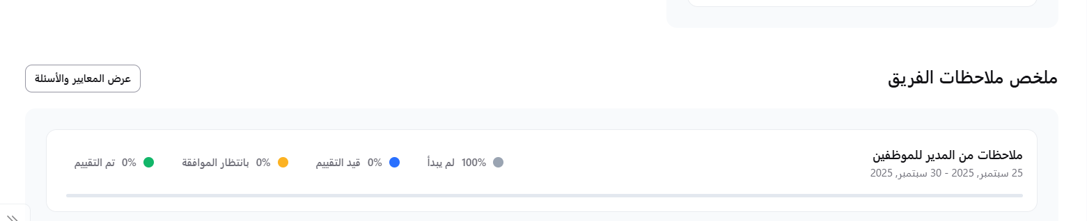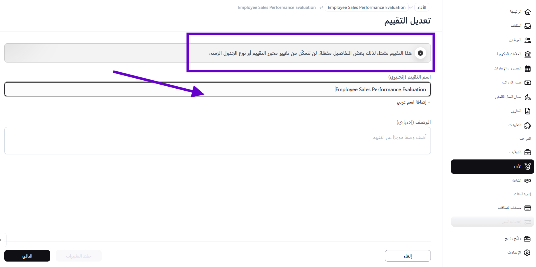 ٣. يمكن تعديل "تفاصيل النموذج" و "المعايير"، مثل اسم النموذج، والوصف، وأسماء المعايير، والمجموعات. ولكن، لا يمكن تعديل "نوع النموذج".آلية التقييم - تقييم الموظف لنفسه، تقييمه للمدير أو تقييم المدير له- ويمكن تفعيل معايير لآلية كانت مغلقة - تقييم الموظف لنفسه، تقييمه للمدير أو تقييم المدير له- في حال لم يقيم أيََا من الموظفين في التقييم.
