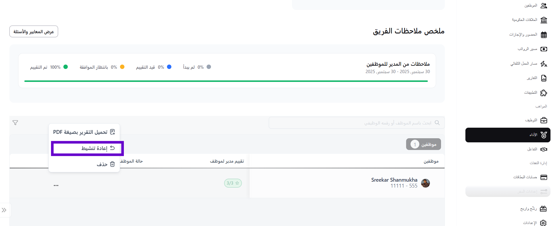5. المشرفون ذو صلاحية "إدارة الأداء" يمكن أن يقوموا بـ "إعادة تنشيط" لنموذج التقييم المكتمل، ليظهر كفعّال مرة أخرى على النظام وذلك في حالة رغبة أحد أطراف عملية التقييم في جعل نموذج التقييم فعّال مرة أخرى.