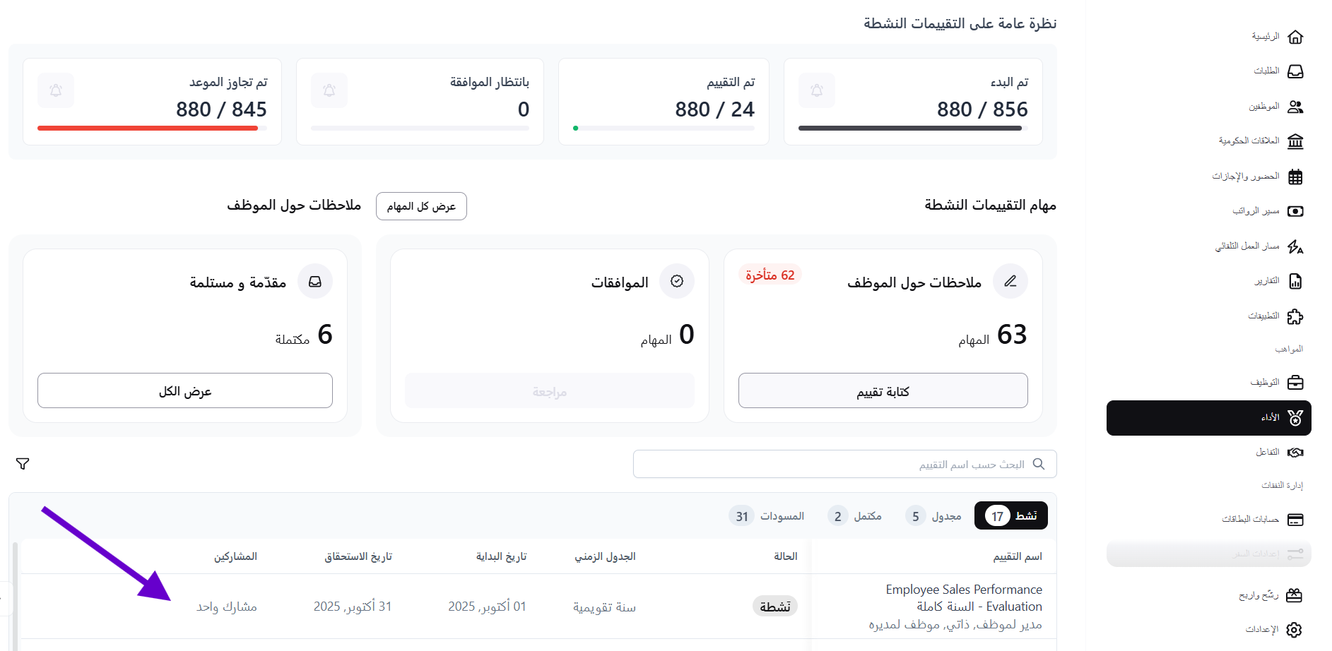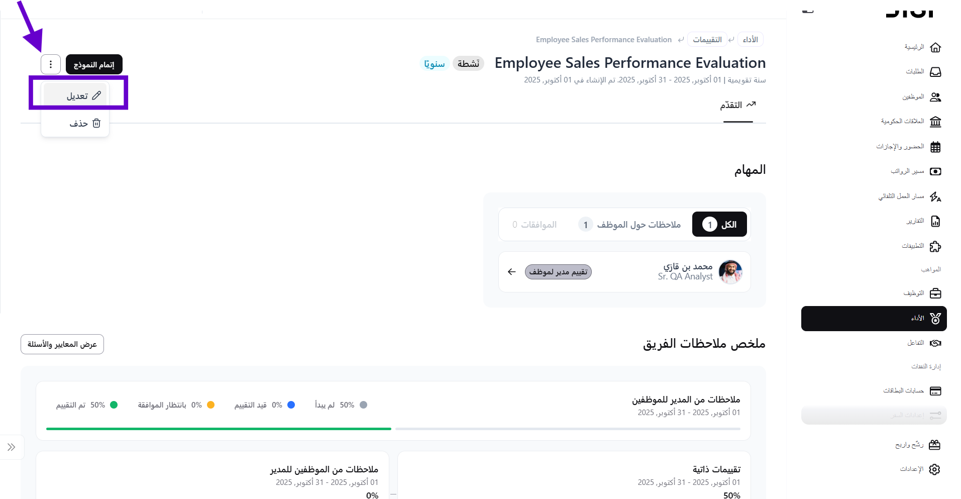 ٢. يمكن إضافة موظفين جدد إلى نموذج التقييم، بالإضافة إلى الموظفين الحاليين المضافين بالفعل للنموذج أثناء إنشائه، من خلال زر "تعديل".