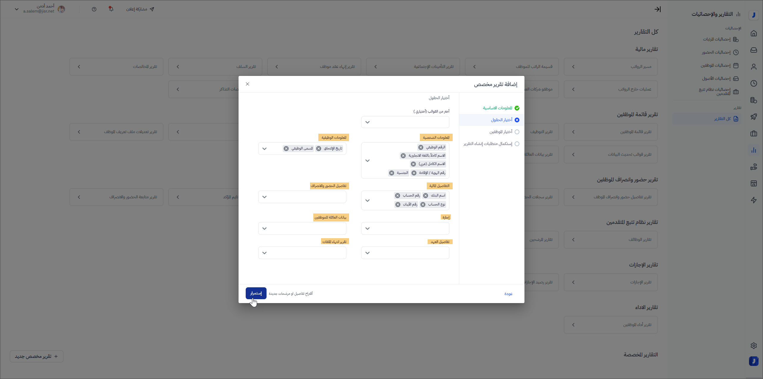 7- قم باختيار المعلومات المراد ظهورها في التقرير المخصص من قائمة الأقسام المتاحة في هذه الصفحة ثم قم بالنقر على خيار استمرار.