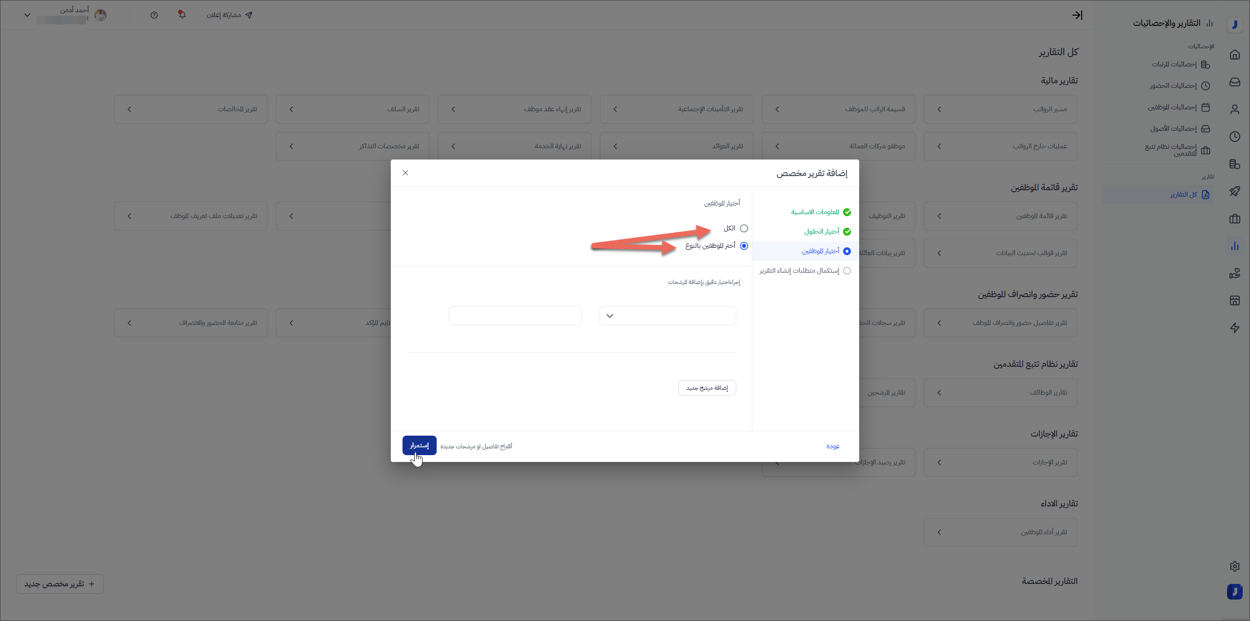 9- قم باختيار كل الموظفين ليتم تضمينهم في هذا التقرير المخصص أو إضافة خيارات ومرشحات إضافية لمزيد من التخصيص من خلال اختيار الخيار ( أختر الموظفين بالنوع ) ، مع إمكانية إضافة أكثر من مرشح على التقرير.