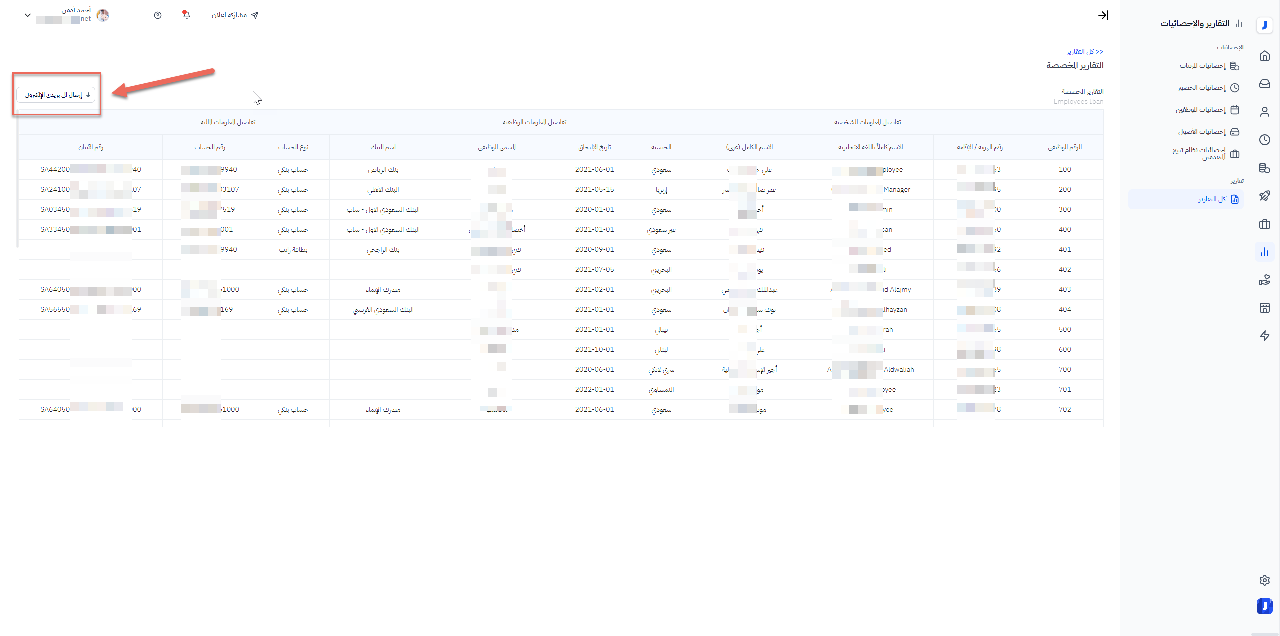 12- يمكن للمستخدم من الحصول على نسخة من هذا التقرير بصيغة ( ملف إكسل ) على البريد الإلكتروني من خلال النقر على الخيار ( ارسال إلى بريدي الإلكتروني ).