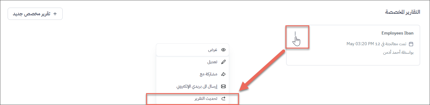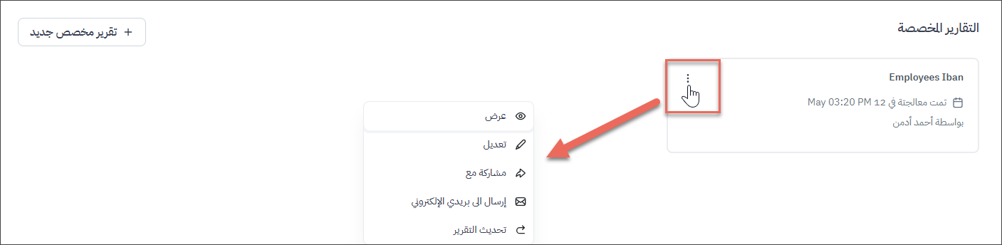 - يمكن لمشرف النظام إدارة أي تقرير مخصص تم إنشاؤه على النظام من خلال النقر على الـ 3 نقاط العمودية ثم اختيار الإجراء المناسب ( عرض - تعديل - مشاركة - إرسال إلى البريد الإلكتروني - تحديث التقرير ).