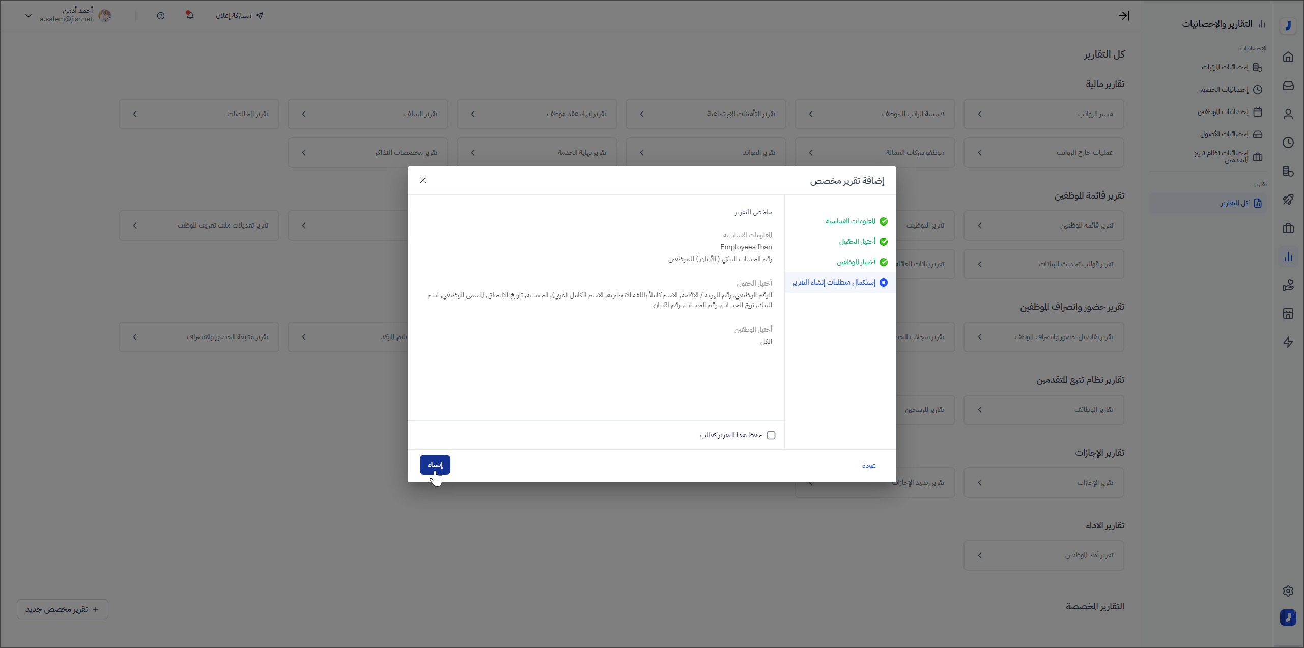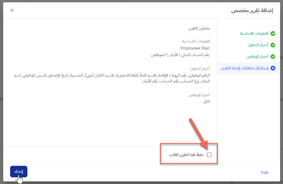 10- في خطوة التحقق من ملخص التقرير ، قم بالتحقق من استكمال متطلبات إنشاء التقرير والمعلومات التي تم اختيارها في الخطوة السابقة قبل إنشاء التقرير ، وقم بالنقر على خيار إنشاء.
