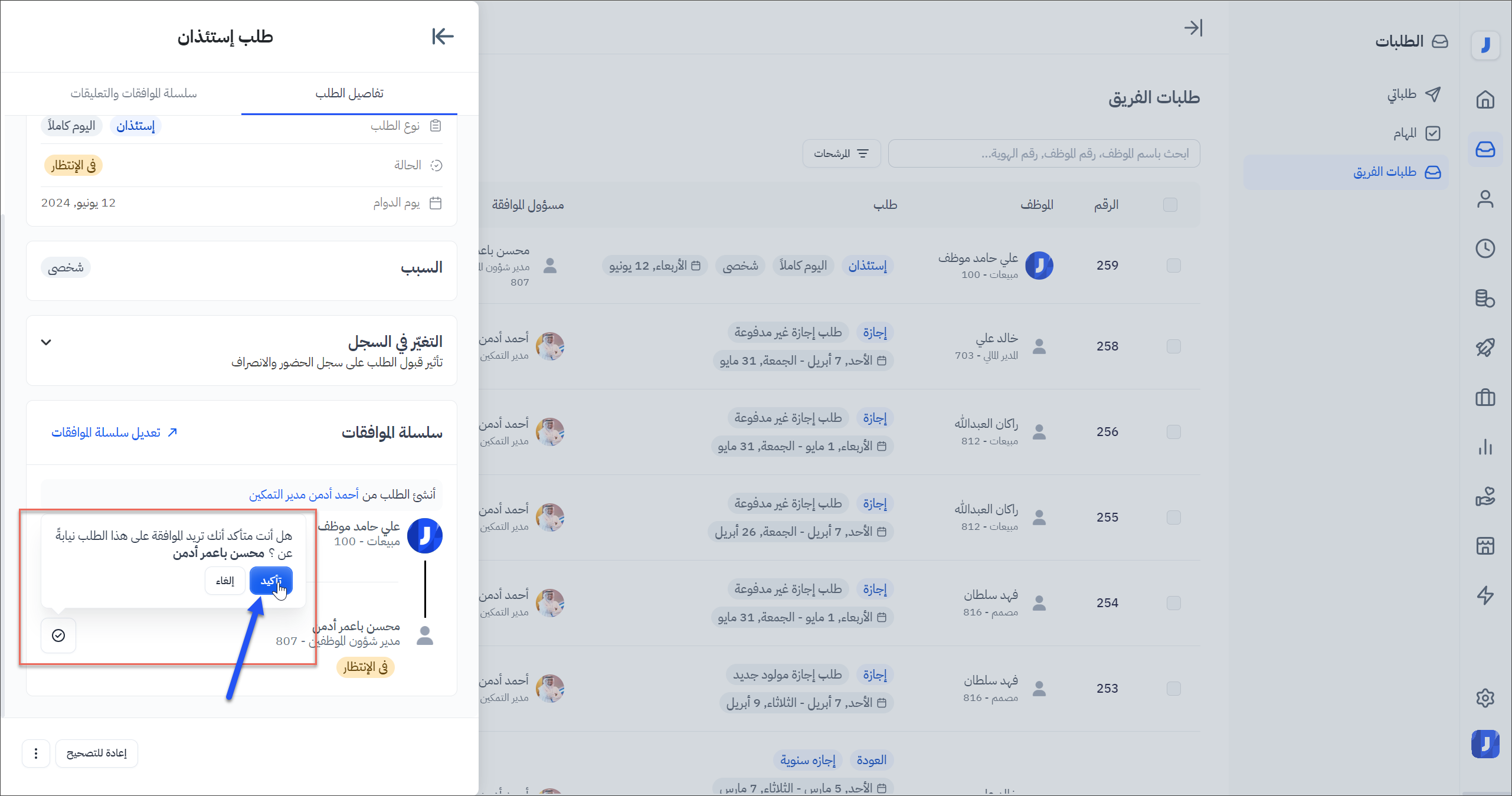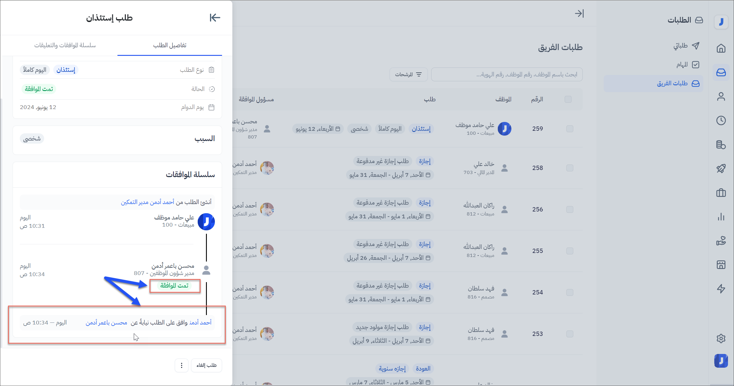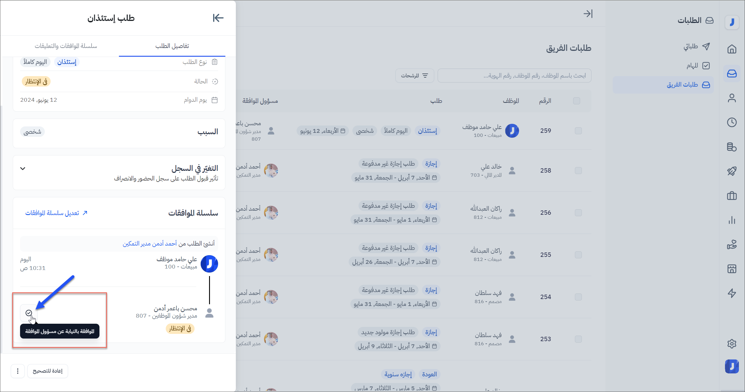 - يمكن الوصول لأيقونة الموافقة المباشرة من خلال الذهاب إلى تفاصيل الطلبات المعلقة من قبل المدراء الآخرين ( حالتها في الانتظار ).