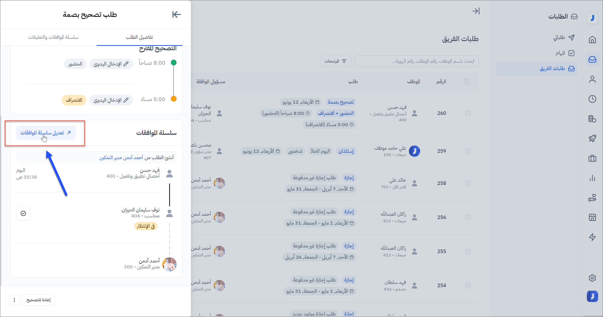 - يمكن لمشرف النظام تحديث سلسلة الموافقات من داخل تفاصيل الطلب من خلال النقر على الخيار ( تعديل سلسلة الموافقات ).