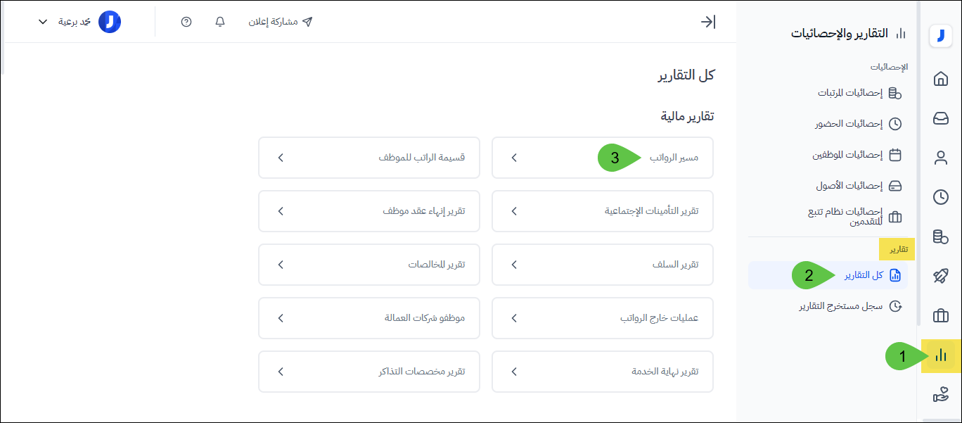 1- بالنقر على زر "التقارير والإحصائيات" في جانب الشاشة.