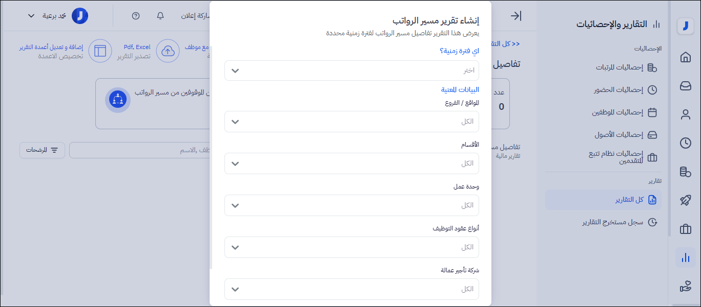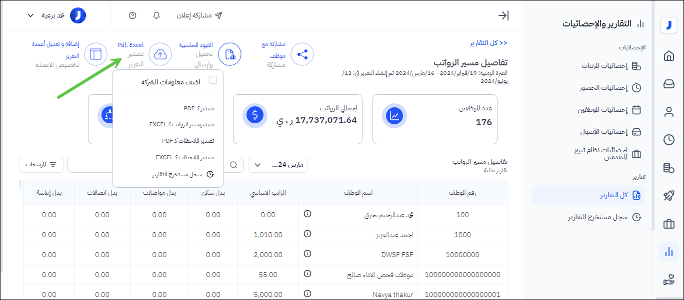 بالنقر على "سجل مستخرج التقارير" يظهر للمستخدم كل التقارير الخاصة بمسير الرواتب التي تم تصديرها.