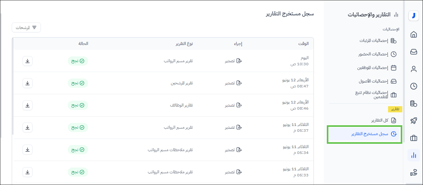 يمكن للمستخدم أيضاً الاطلاع على سجل مستخرج التقارير لكل أنواع التقارير بشكل عام، من خلال النقر على "التقارير والإحصائيات" على جانب الشاشة ثم النزول تحت تبويب "تقارير" ثم النقر على "سجل مستخرج التقارير" لتظهر كل التقارير التي تم تصديرها، ويمكن تحميل أي تقرير تم خلال آخر 14 يوماً.