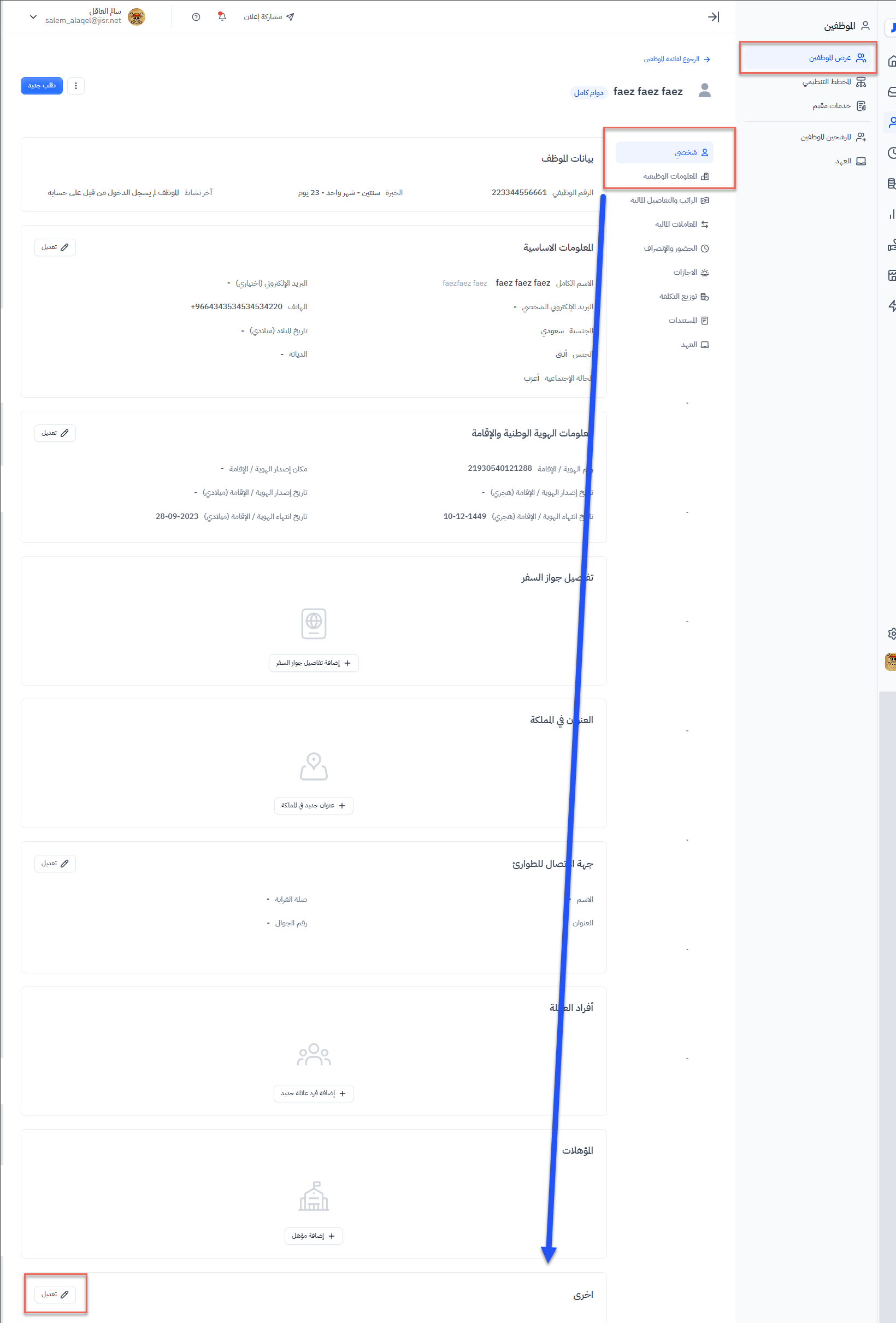 عرض الموظفين > قم باختيار الموظف > قم بالانتقال الى تبويب ( شخصي / المعلومات الوظيفية ) > قم بالانتقال الى الجزء المخصص ( أخرى ) > انقر على خيار تعديل > قم بإدخال المعلومات في الحقول المخصصة التي تمت تعريفها مسبقاً.