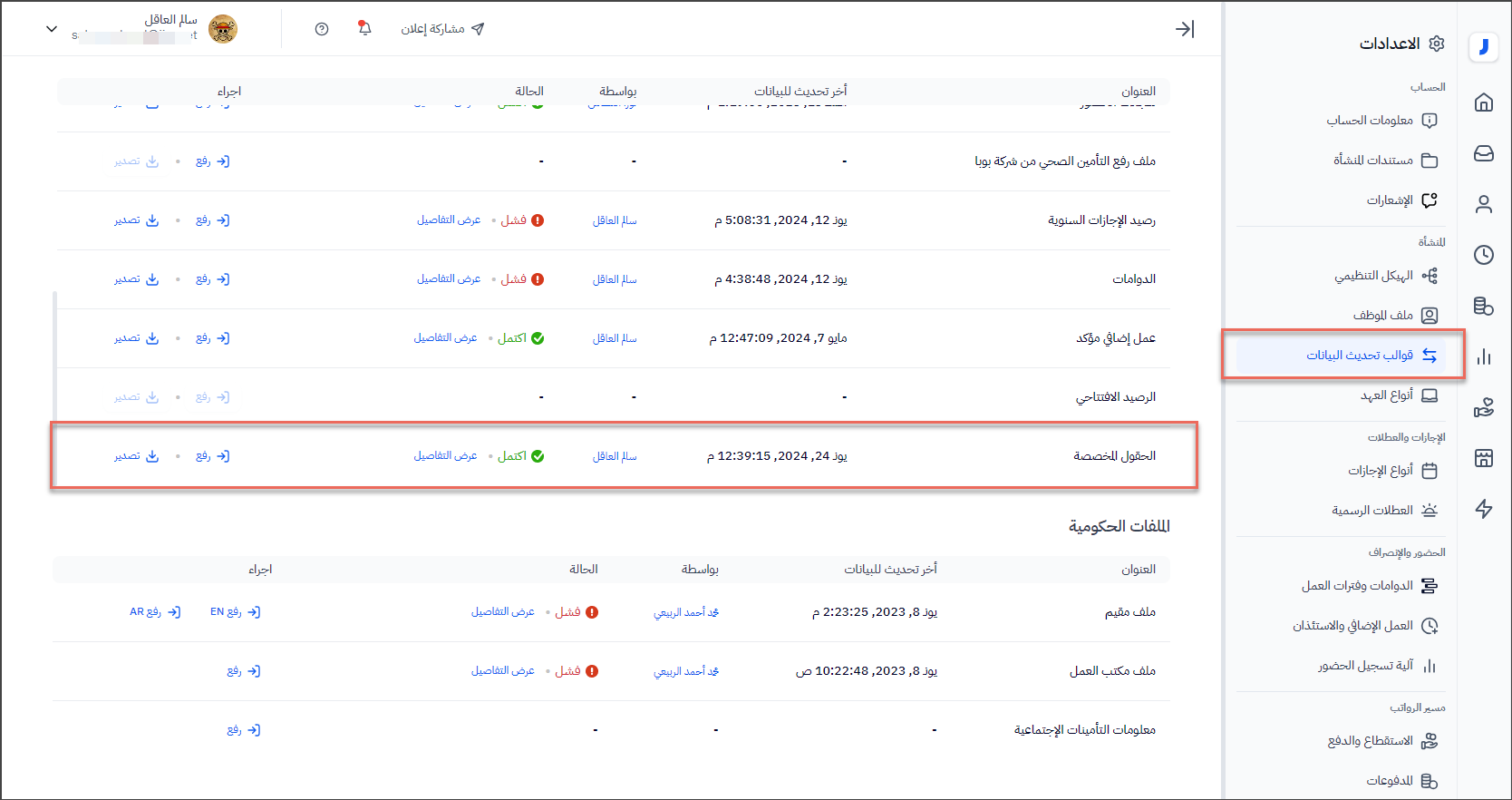 صفحة الإعدادات > قوالب تحديث البيانات > قالب الحقول المخصصة > تصدير > قم بتعبئة الحقول المطلوبة في القالب > قم برفع القالب مرة أخرى على النظام.