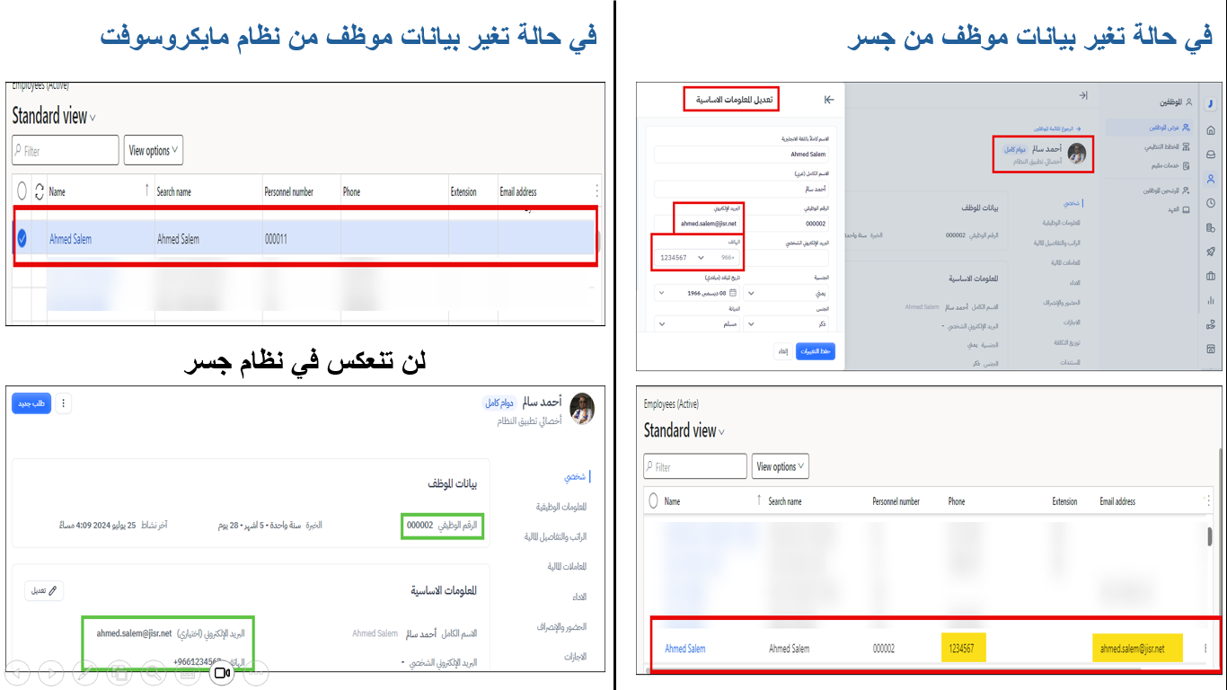 - عند عمل تغييرات على معلومات الموظف في جسر