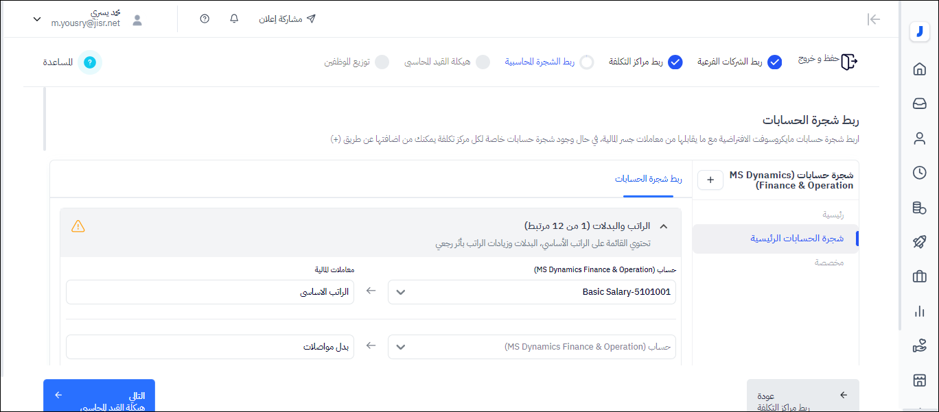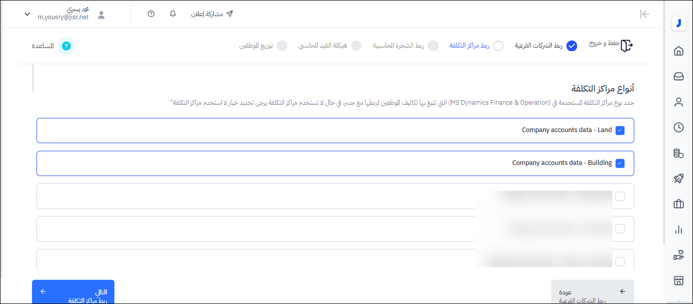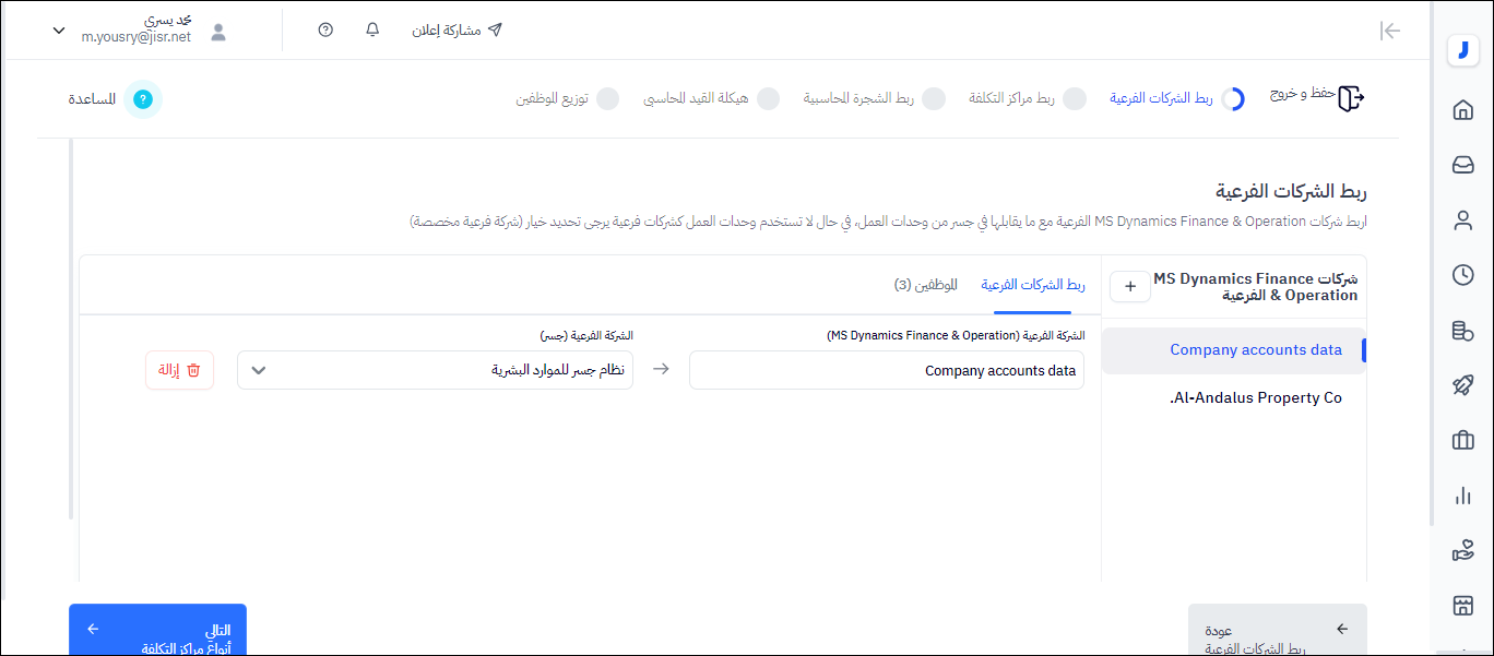 وبعد النقر على "التالي" تظهر هذه الشاشة التي تطلب من العميل بربط الشركات الفرعية المتواجدة في النظام المحاسبي مع ما يقابلها في جسر من وحدات العمل.