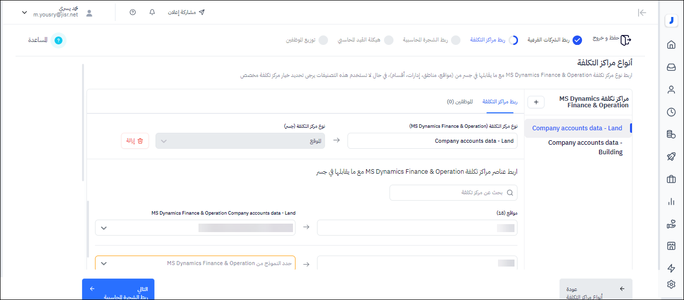 يقوم المستخدم بربط نوع مركز تكلفة MS Dynamics Finance & Operation مع ما يقابلها في جسر من (مواقع، مناطق، إدارات، أقسام)، في حال لا تستخدم هذه التصنيفات يرجى تحديد خيار مركز تكلفة مخصص.