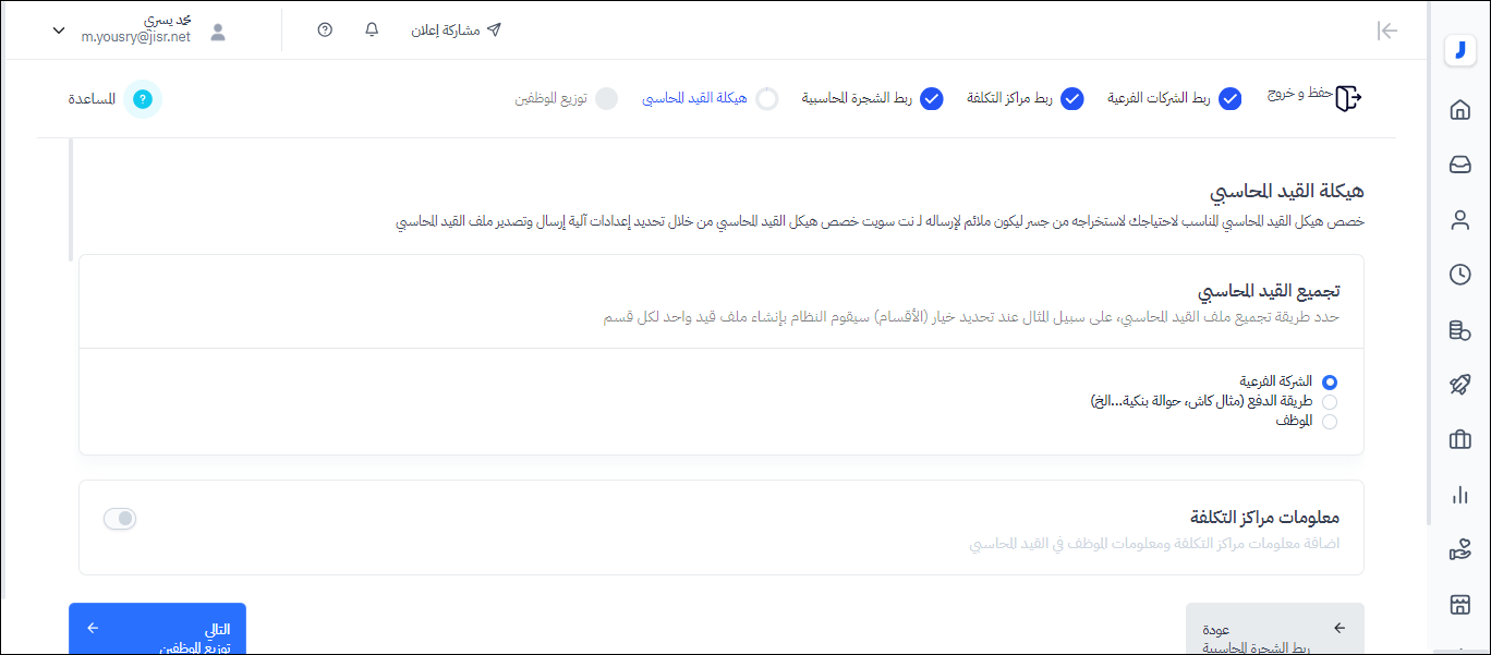 بعد ربط الشركات الفرعية يقوم المستخدم بربط نوع مراكز التكلفة المستخدمة في النظام المحاسبي التي يمكن للمستخدم من خلالها تتبع تكاليف الموظفين بها وربطها مع جسر، وفي حال لا تستخدم مراكز التكلفة يرجى تحديد خيار "لا استخدم مراكز التكلفة".