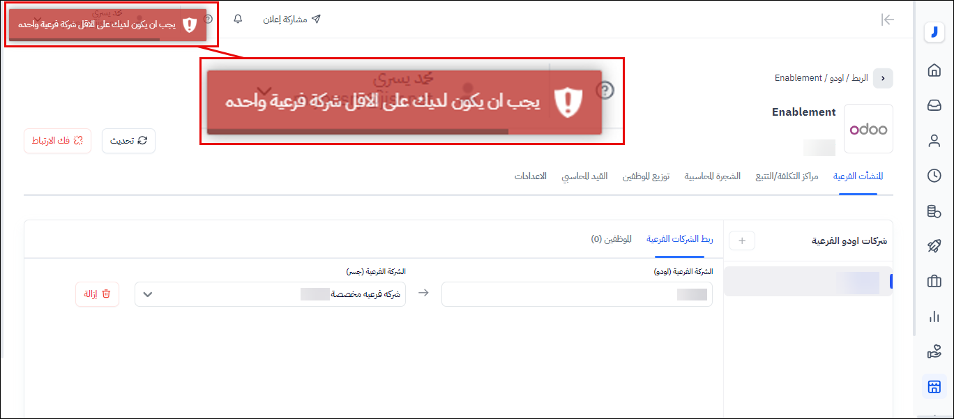 ملحوظة: بعض الأنظمة المحاسبية في عملية الربط يتطلب أن يكون للعميل شركة فرعية واحدة على الأقل، ويعتبر الحل في هذه الحالة أنه يمكنه ربط الشركة الخاصة به (في النظام المحاسبي) ب شركة فرعية مخصصة (في نظام جسر) ثم إضافة الموظفين على الشركة المخصصة من خلال تبويب "الموظفين أو في مرحلة "توزيع الموظفين".