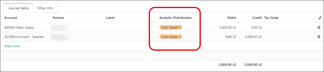 ملحوظة: في حالة تفعيل "معلومات مراكز التكلفة" ستظهر معلومات مراكز التكلفة في القيد المحاسبي