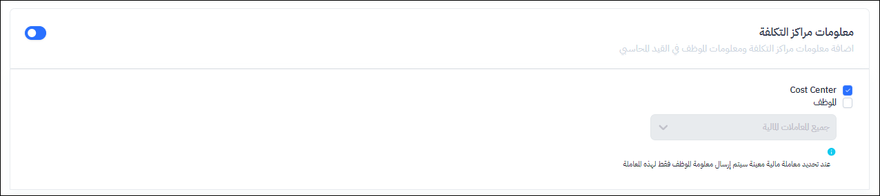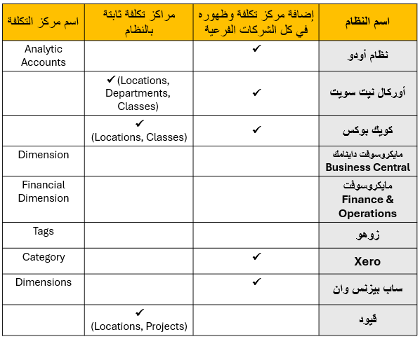 ملحوظة: بعض الأنظمة المحاسبية في عملية الربط تتيح إمكانية إضافة مراكز التكلفة، وبعض الأنظمة توفر مراكز تكلفة ثابتة في النظام، وبعض الأنظمة تظهر مراكز التكلفة باسم محدد على سبيل المثال: مركز التكلفة في نظام أودو يكون باسم Analytic Accounts.