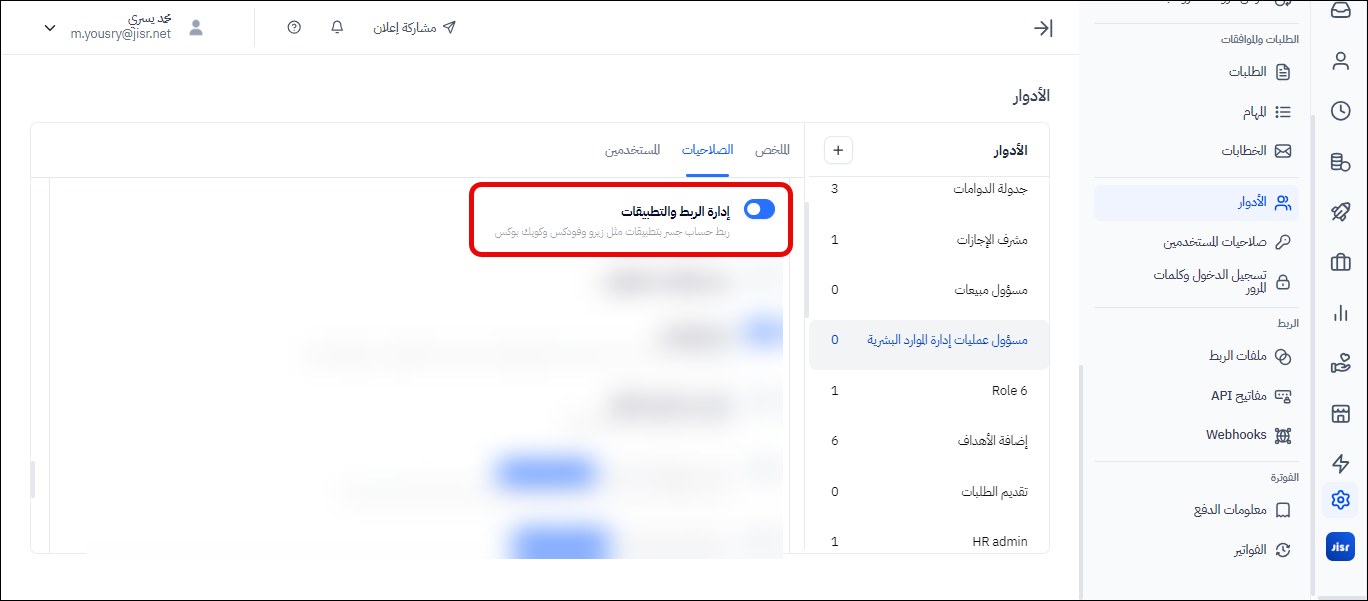 ملحوظة: يجب على المستخدم الذي سيقوم بتفعيل عملية الربط المحاسبي، أن يكون له صلاحية "إدارة الربط والتطبيقات" من نظام جسر.