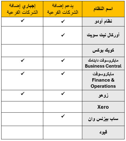 وفيما يلي الأنظمة التي تدعم للمستخدم إضافة الشركات الفرعية في النظام، وفي العمود الآخر توضيح للأنظمة التي تجبر المستخدم على إضافة شركة فرعية واحدة على الأقل بها أثناء عملية الربط.
