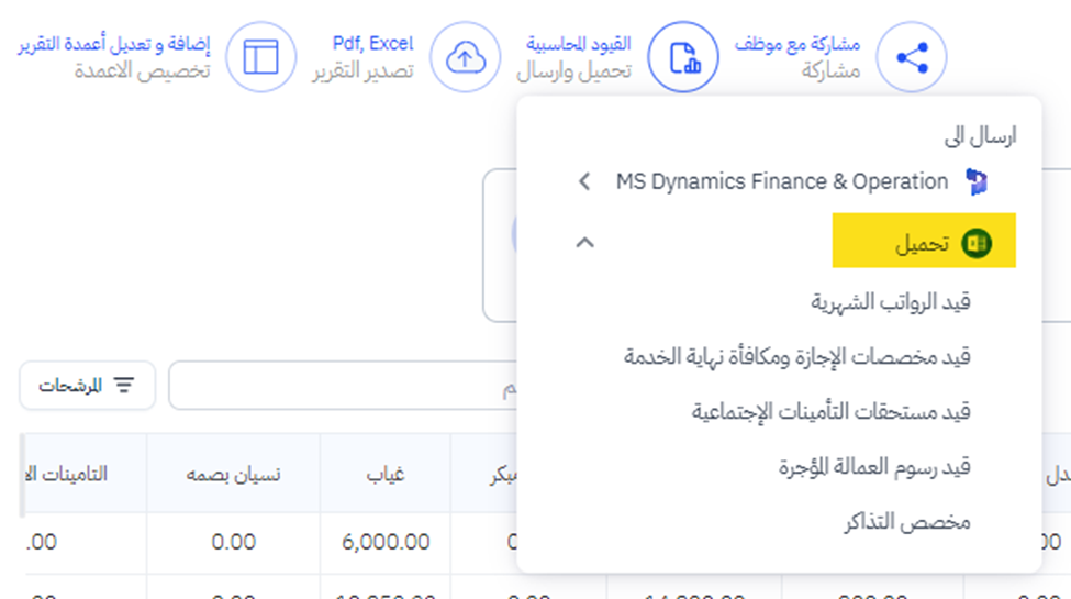سيظهر للمستخدم اختيارين أما إرسال القيود المحاسبية إلى النظام المحاسبي، أو يمكنه النقر على (تحميل إكسل) ثم اختيار القيود المحاسبية المراد تحميلها في ملف إكسل