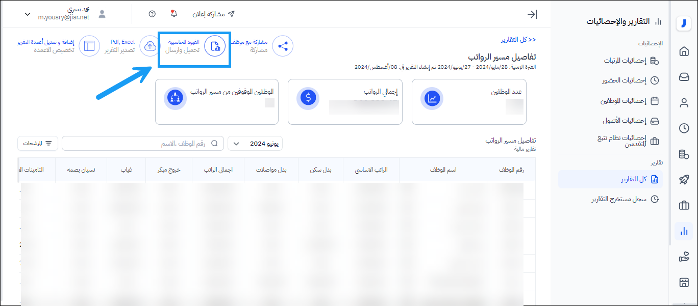 ويمكن للمستخدم الاستفادة من هذه الميزة عن طريق النقر على "القيود المحاسبية - تحميل وإرسال" في مسير الرواتب.