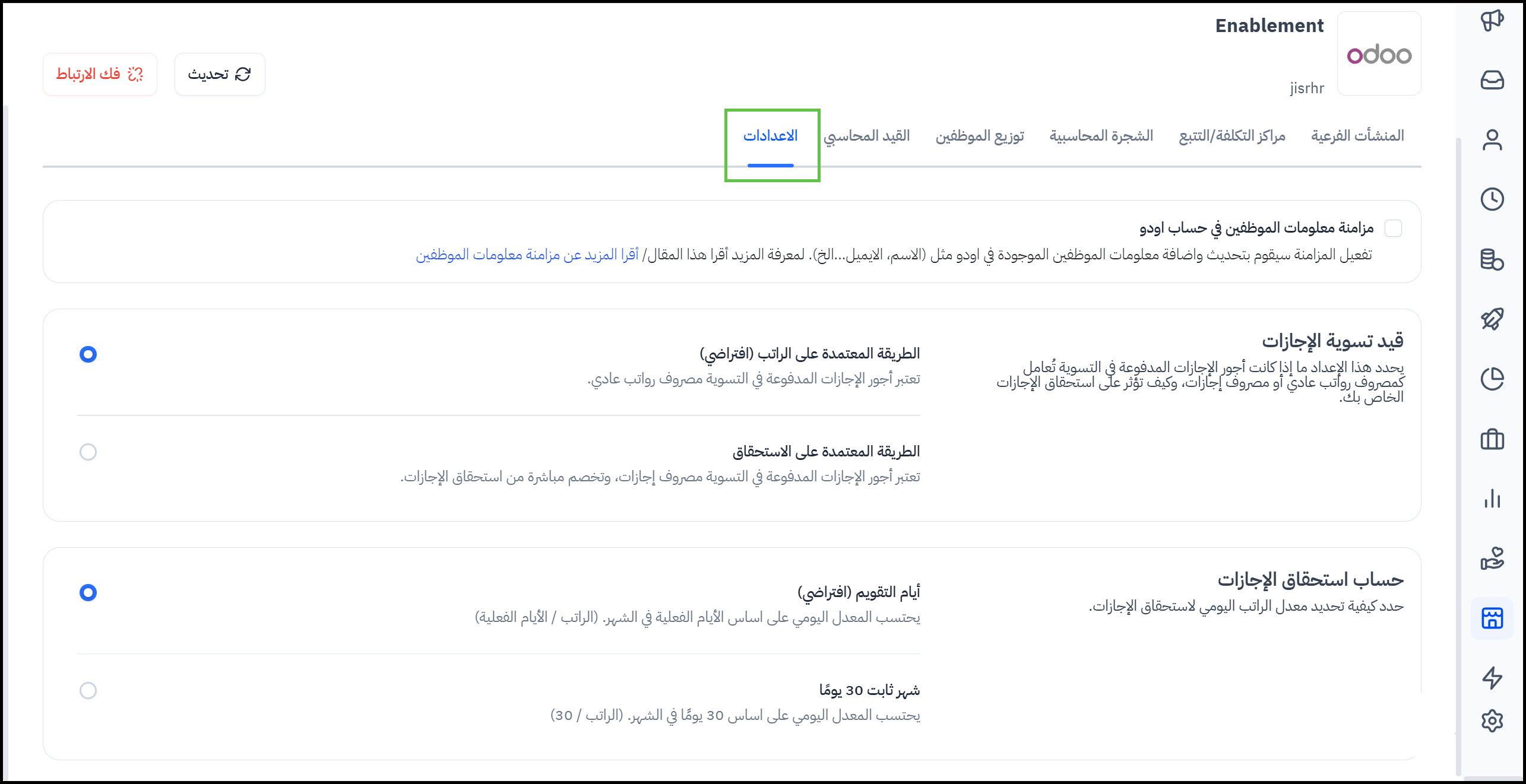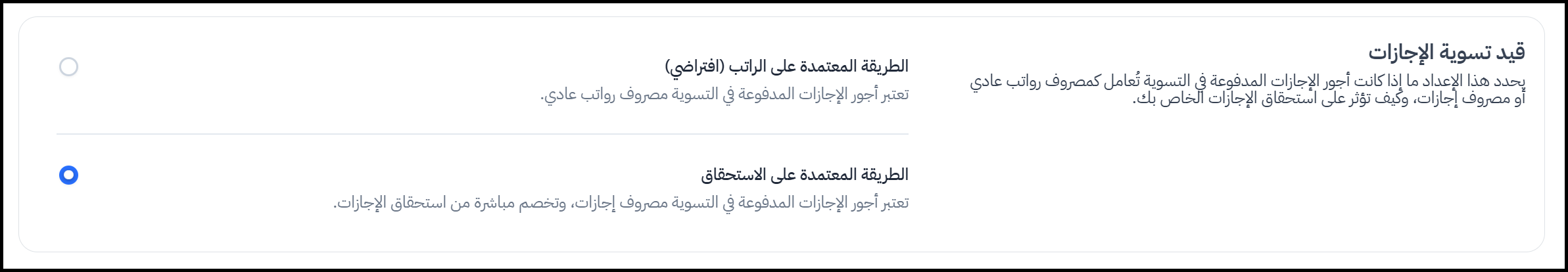 يمكن للمستخدم اختيار طريقة قيد تسوية الإجازات وتحديد ما إذا كانت أجور الإجازات المدفوعة في التسوية تٌعامل كمصروف رواتب عادي أو مصروف إجازات.