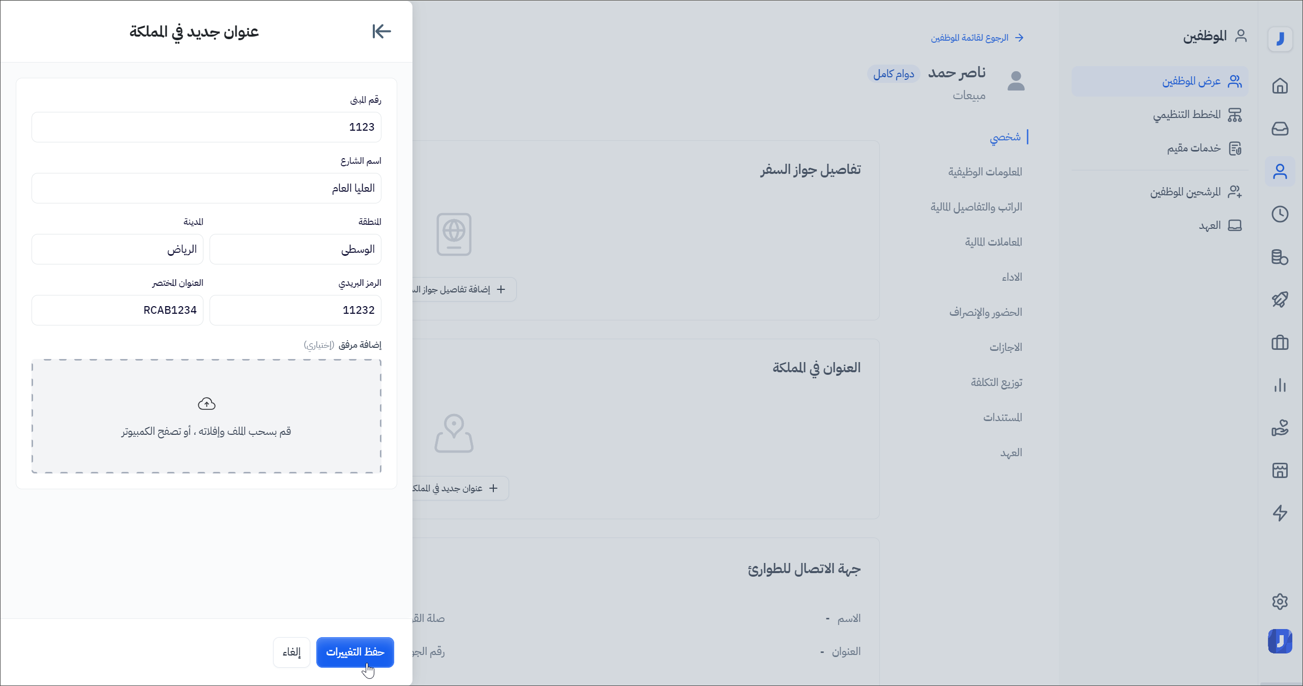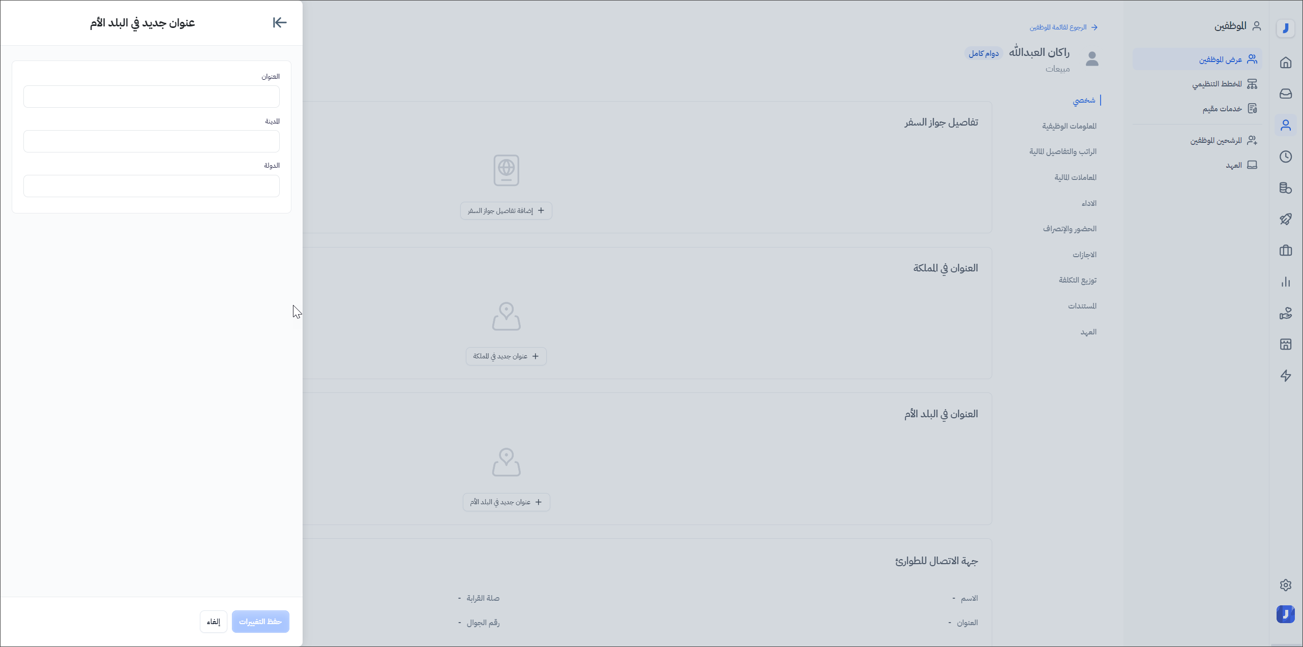 من صفحة عرض الموظفين > اختيار الموظف > شخصي > العنوان في المملكة > إضافة عنوان جديد في المملكة / البلد الأم