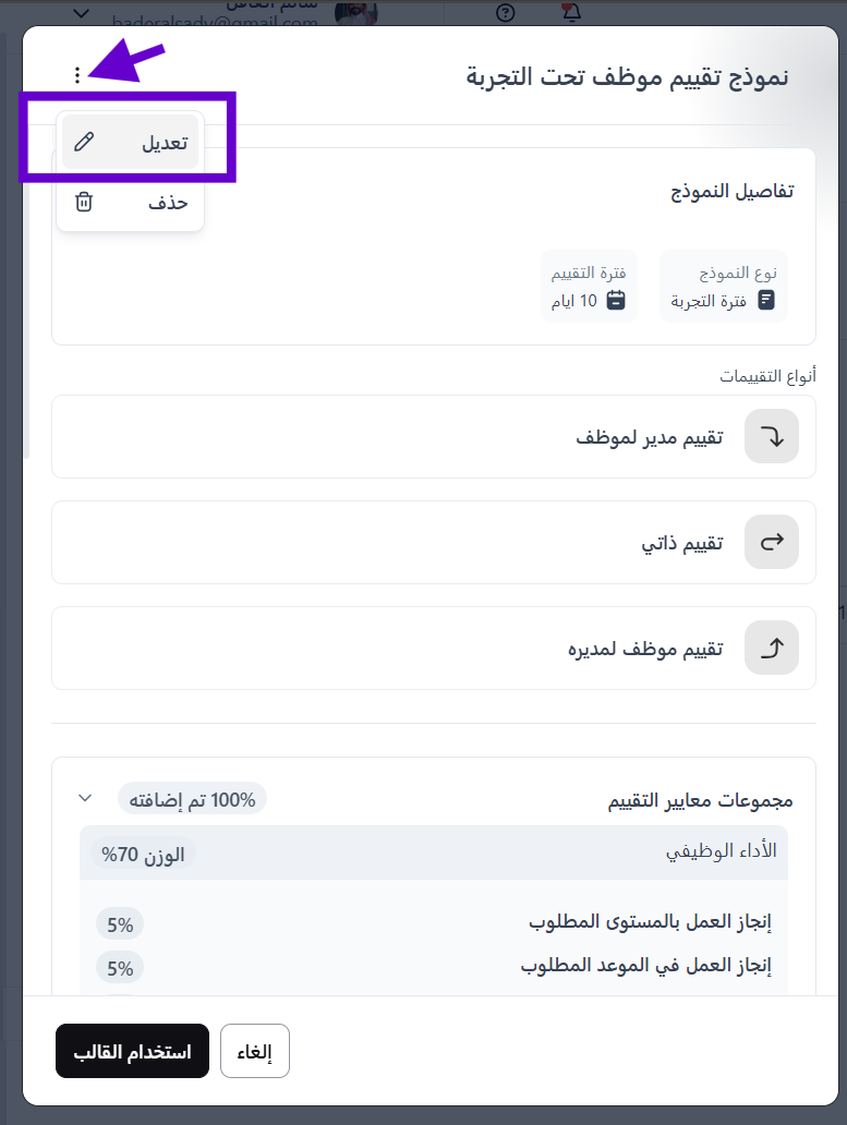 - عند استخدام القوالب لإنشاء نموذج تقييم، يمكن التعديل عليها بشكل كامل من حيث، الاسم، الوصف، نوع النموذج، المعايير.