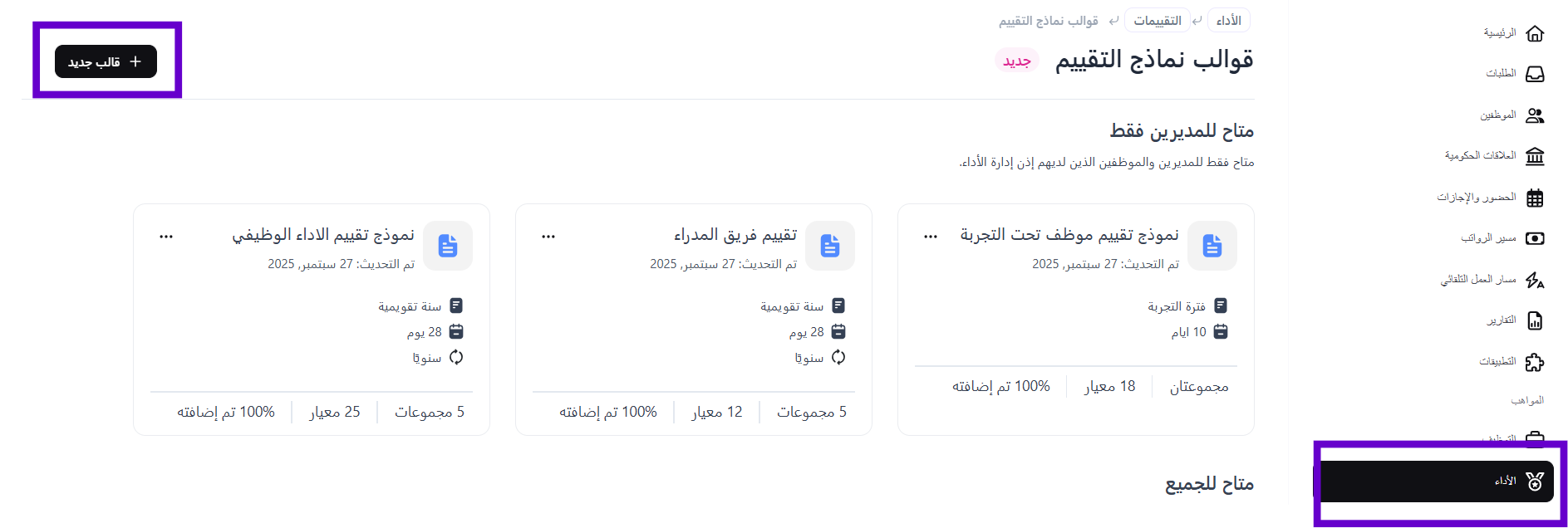 - خاصية إنشاء القوالب متاحة فقط للمستخدمين بصلاحية إدارة الأداء.